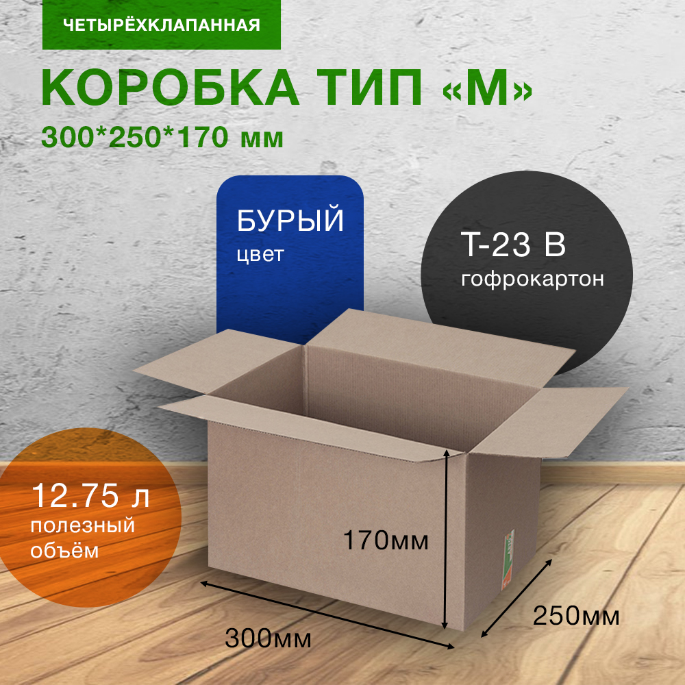 Картонный короб СДЭК тип «M» бурого цвета, длиной 300 мм, шириной 250 мм и высотой 170 мм. Изготовлен из трехслойного картона марки Т-23 В. Полезный объём — 12.75 л.