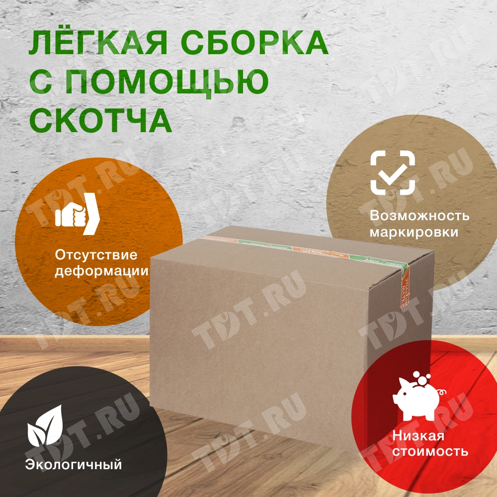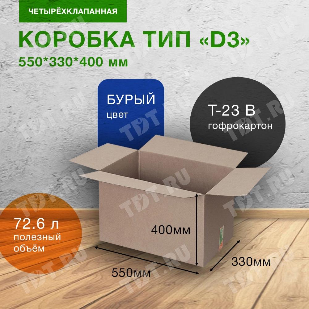 Картонный короб Деловые Линии тип «D3» бурого цвета, длиной 550 мм, шириной 330 мм и высотой 400 мм. Изготовлен из трехслойного картона марки Т-23 В. Полезный объём — 72.6 л.