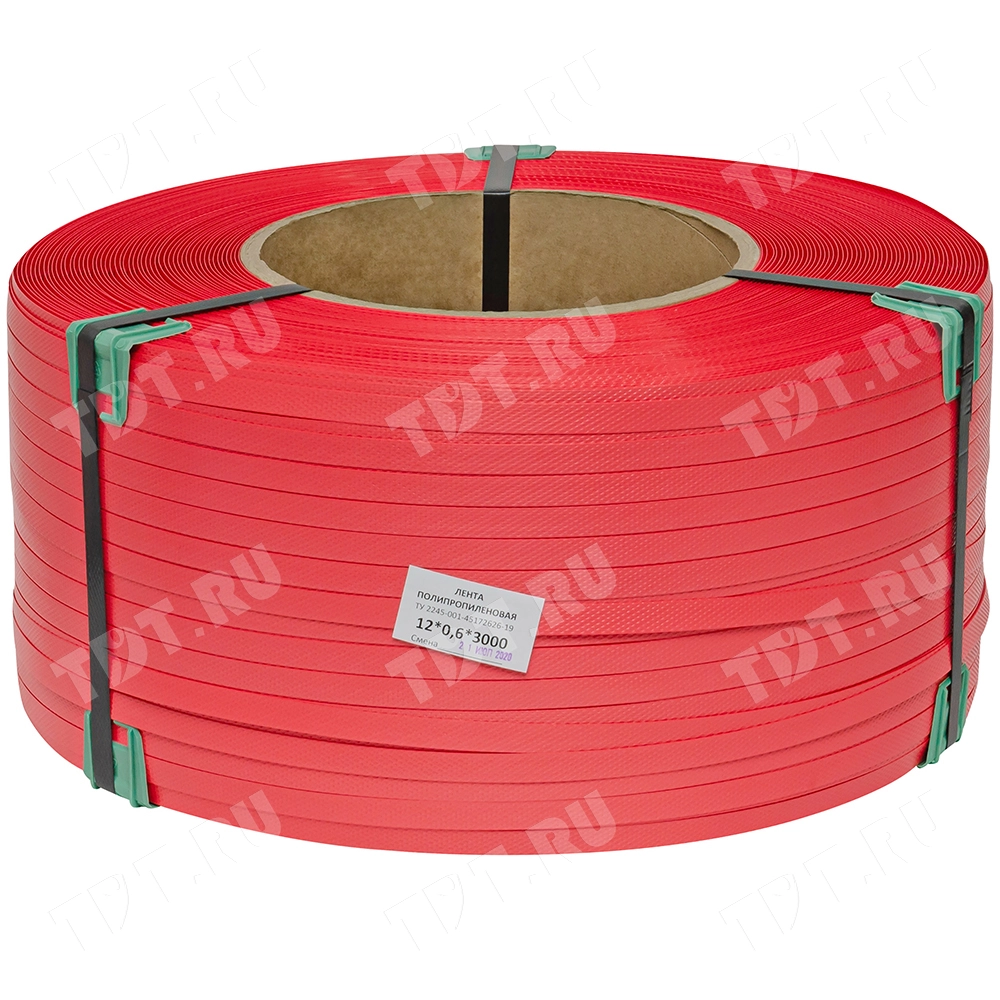 Упаковочная полипропиленовая лента (ПП) Лентапром, красного цвета, намоткой 3000 м, шириной 12 мм, толщиной 0.6 мм, усилием на разрыв 140 кГс, весом 12.21 кг, транспортировочным объемом 0.030345 м³. Диапазон рабочих температур от -30 до +60°C. Производится в России.