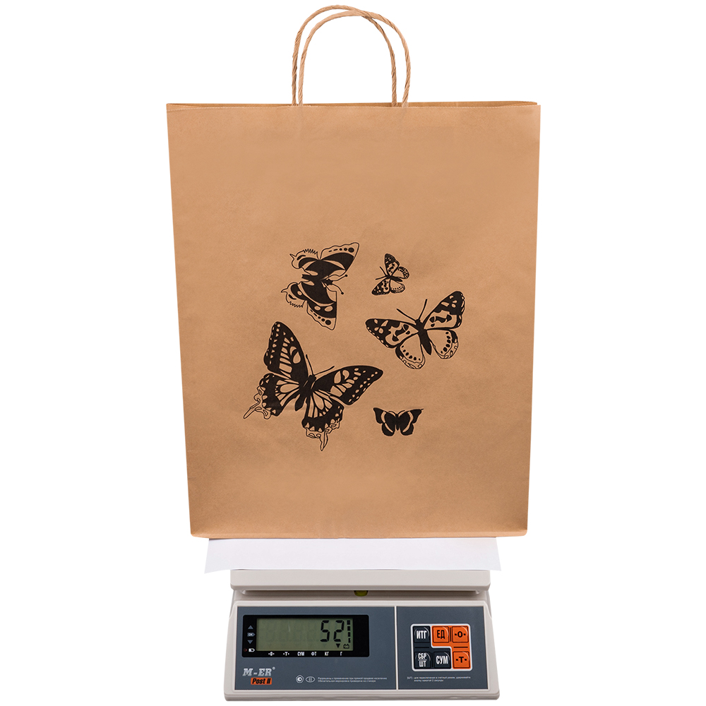 Бумажный крафт пакет с крученой ручкой и рисунком «Бабочки» шириной 150 мм, длиной 350 мм, высотой 450 мм изготовлен из экологичного материала. Пакеты производятся в России.
