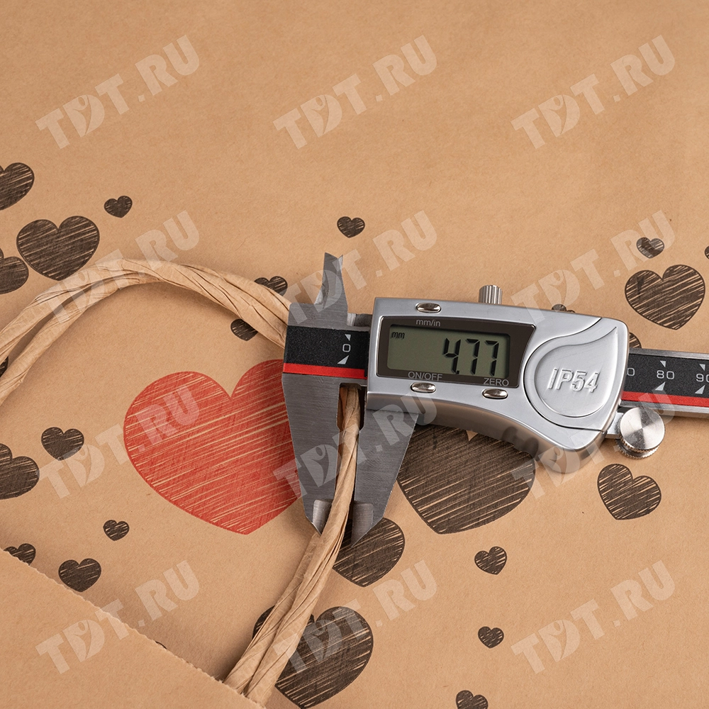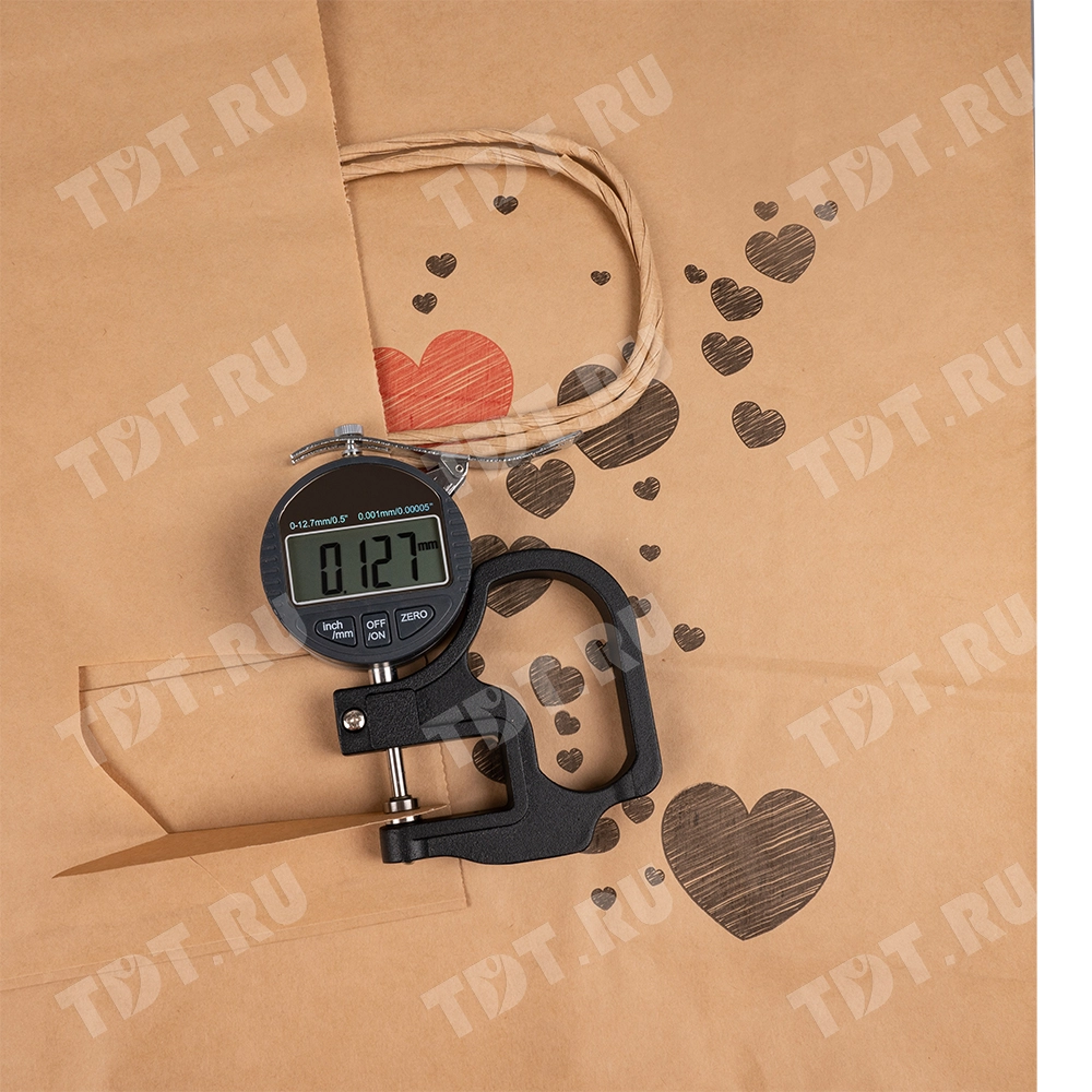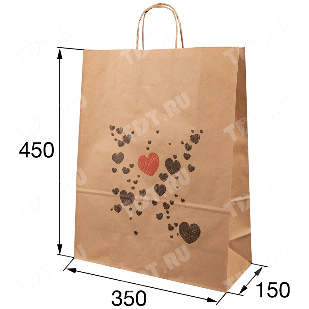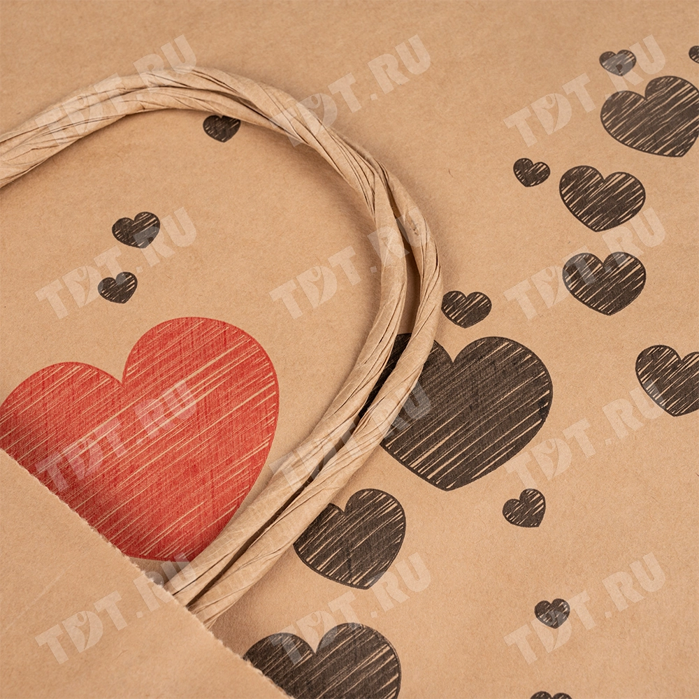 Бумажный крафт пакет с крученой ручкой и рисунком «Сердечки» шириной 150 мм, длиной 350 мм, высотой 450 мм изготовлен из экологичного материала. Пакеты производятся в России.