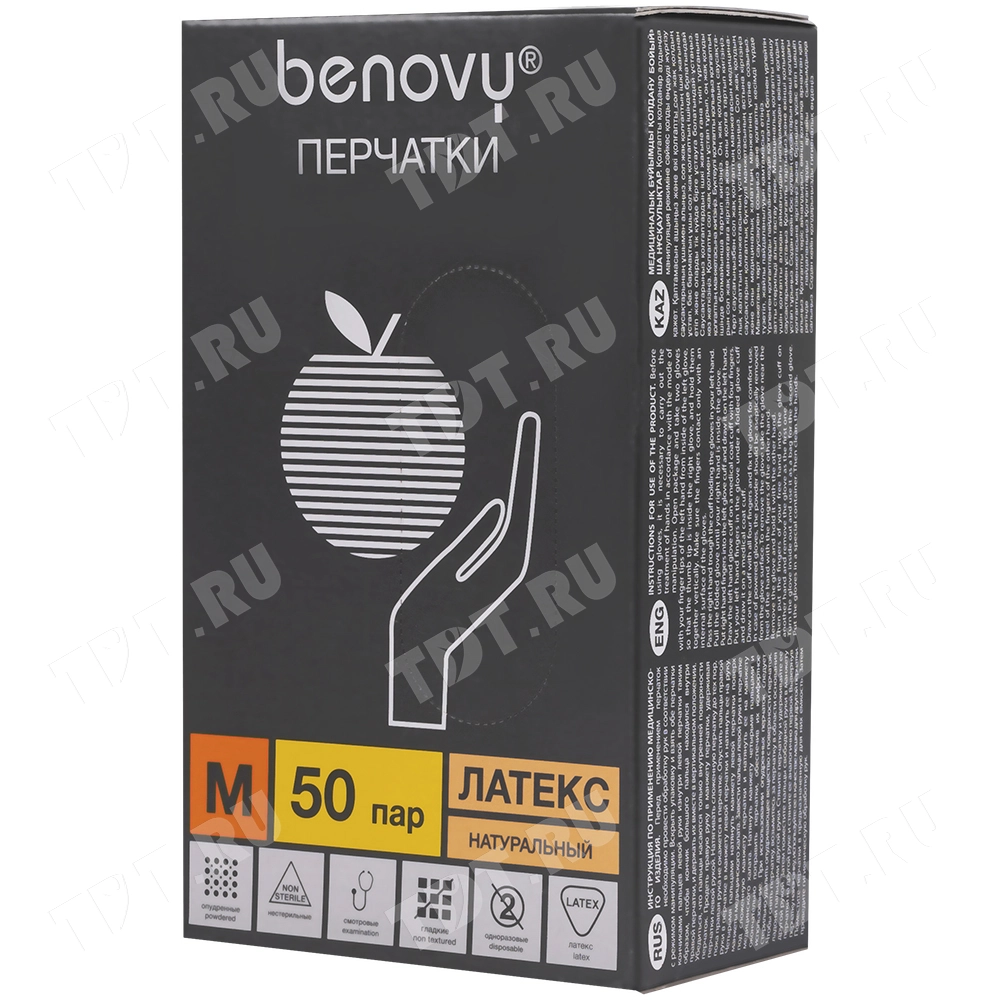 Одноразовые опудренные латексные перчатки Benovy, размера M, гладкие, бежевого цвета, в упаковке по 100 штук (50 пар). Перчатки для индивидуальной защиты рук. Внутренняя часть обработана кукурузным крахмалом, что позволяет легко снимать и надевать перчатки. Материал – натуральный латекс. Производятся в Малайзии.
