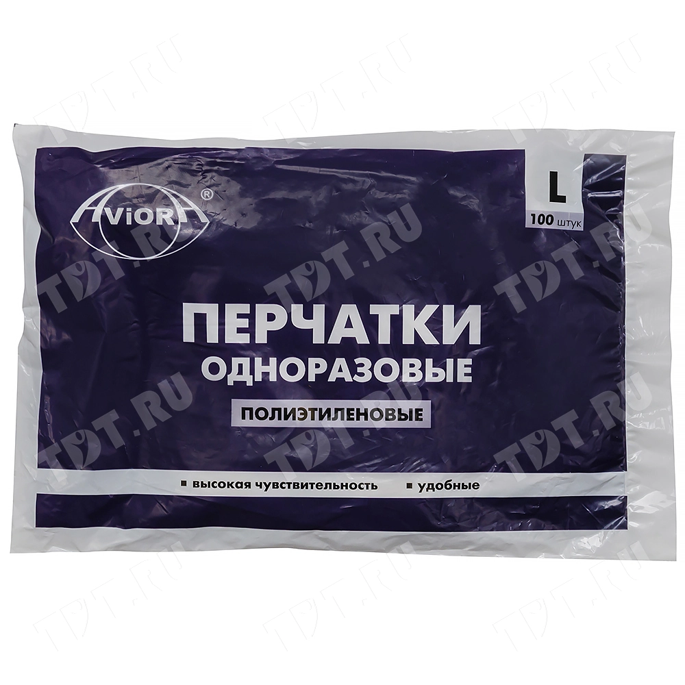 Одноразовые полиэтиленовые перчатки Aviora, размера L, неопудренные, прозрачного цвета, в упаковке по 100 штук. Материал – 100% полиэтилен. Производятся в Китае.