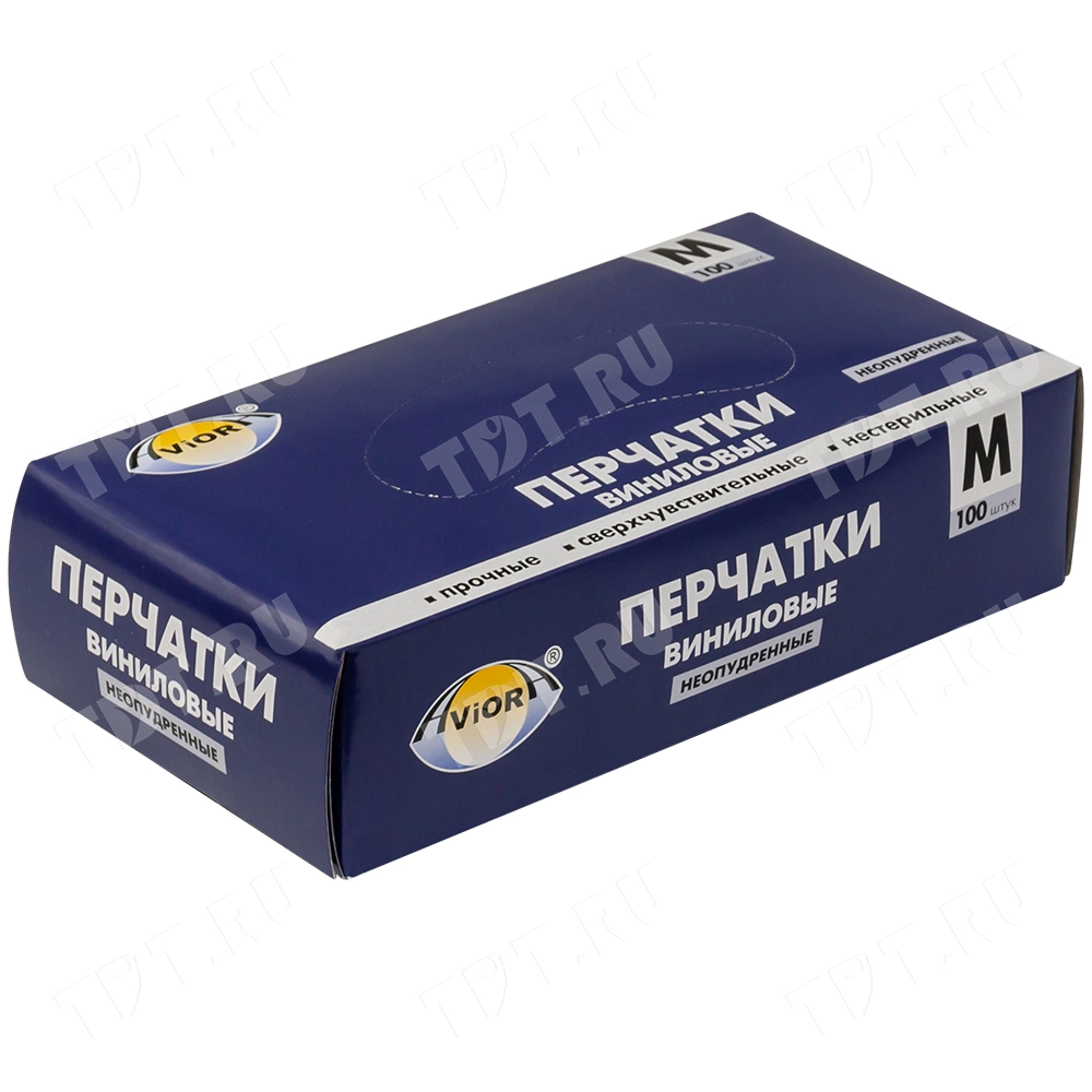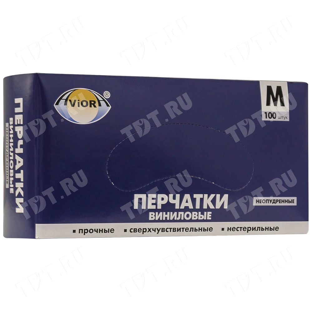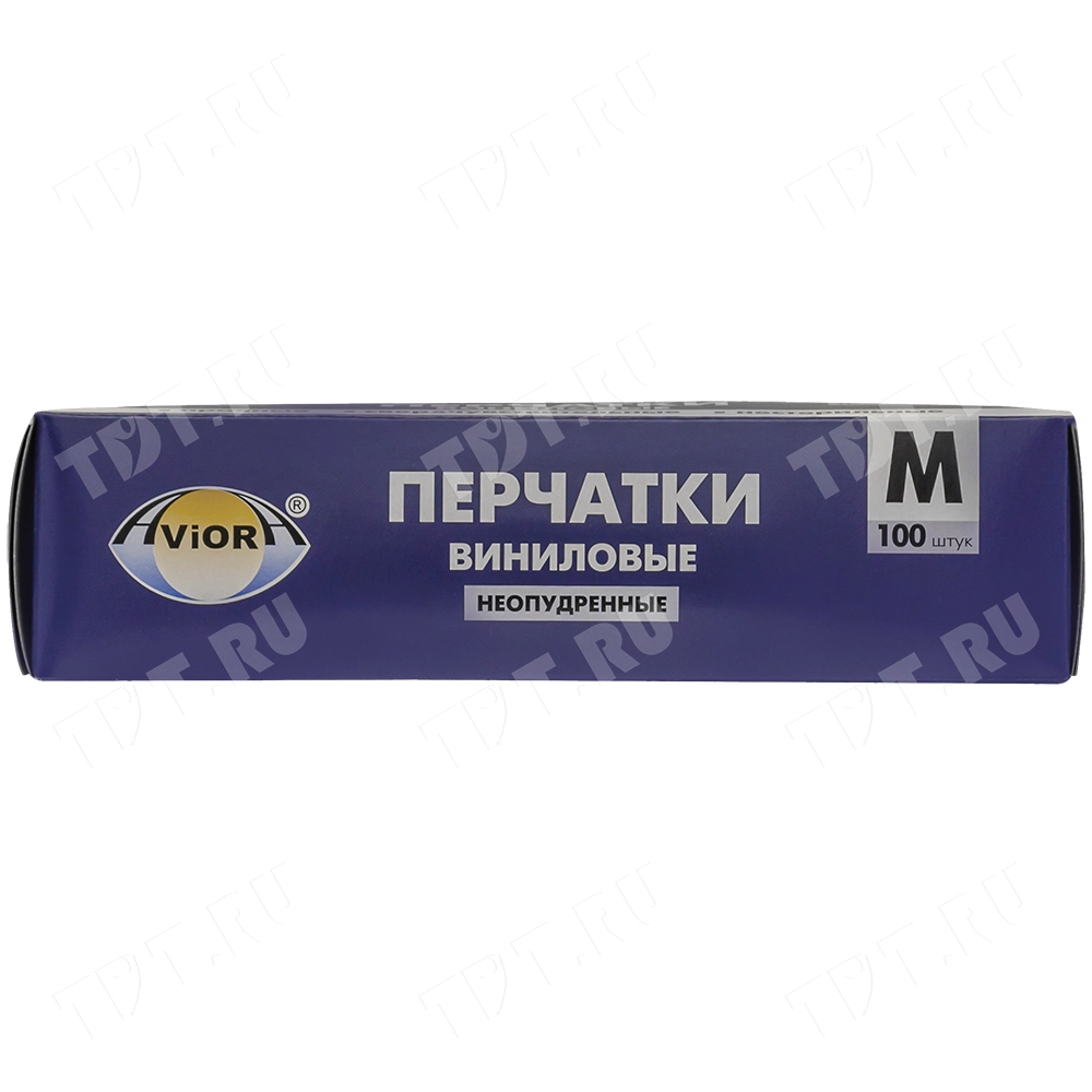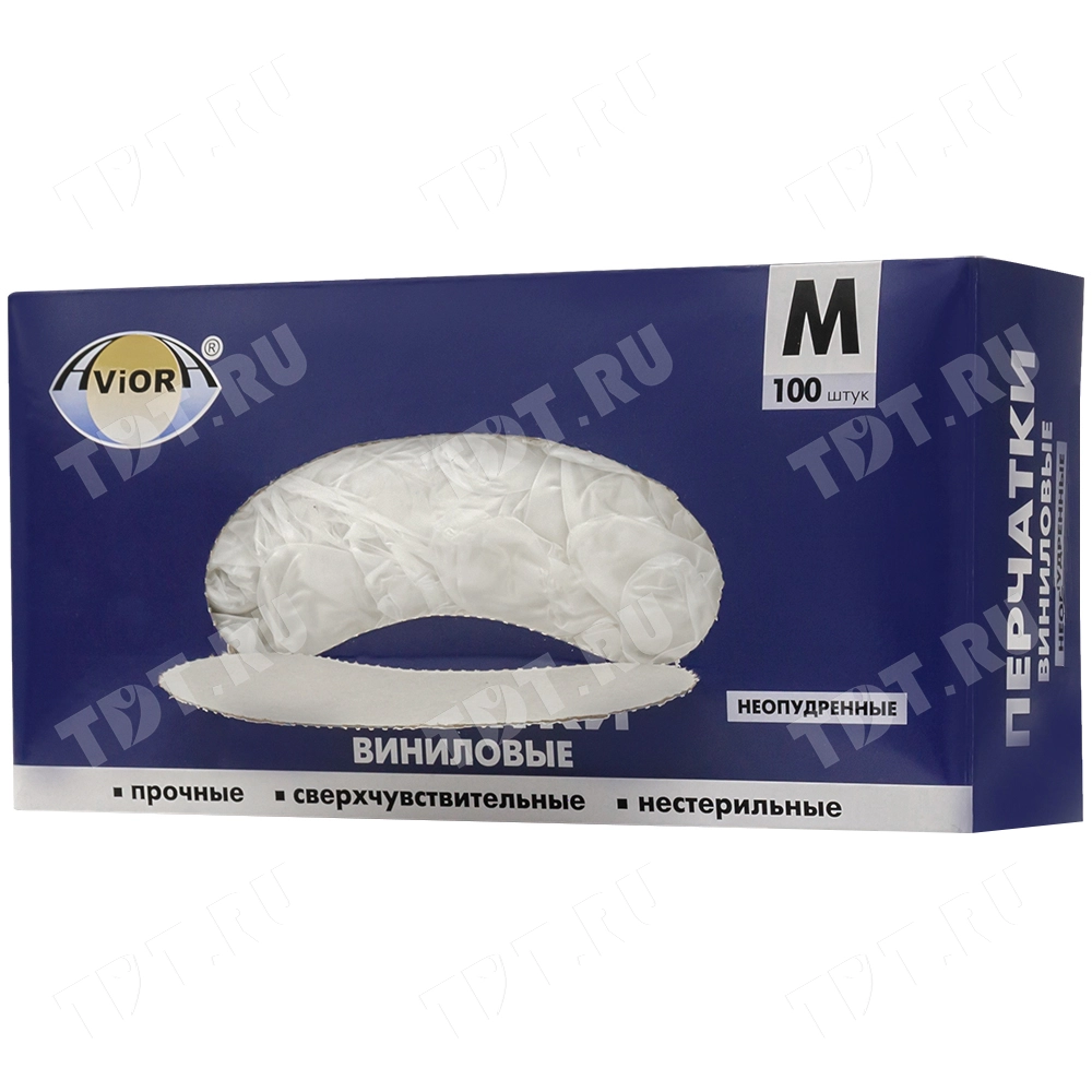 Одноразовые виниловые перчатки Aviora, размер M, бело-прозрачного цвета, неопудренные, нестерильные, в упаковке по 100 шт. Предназначены для защиты рук при уборке, приготовлении пищи, косметических процедурах. Материал – поливинилхлорид. Производятся в Китае.