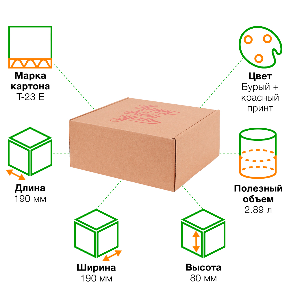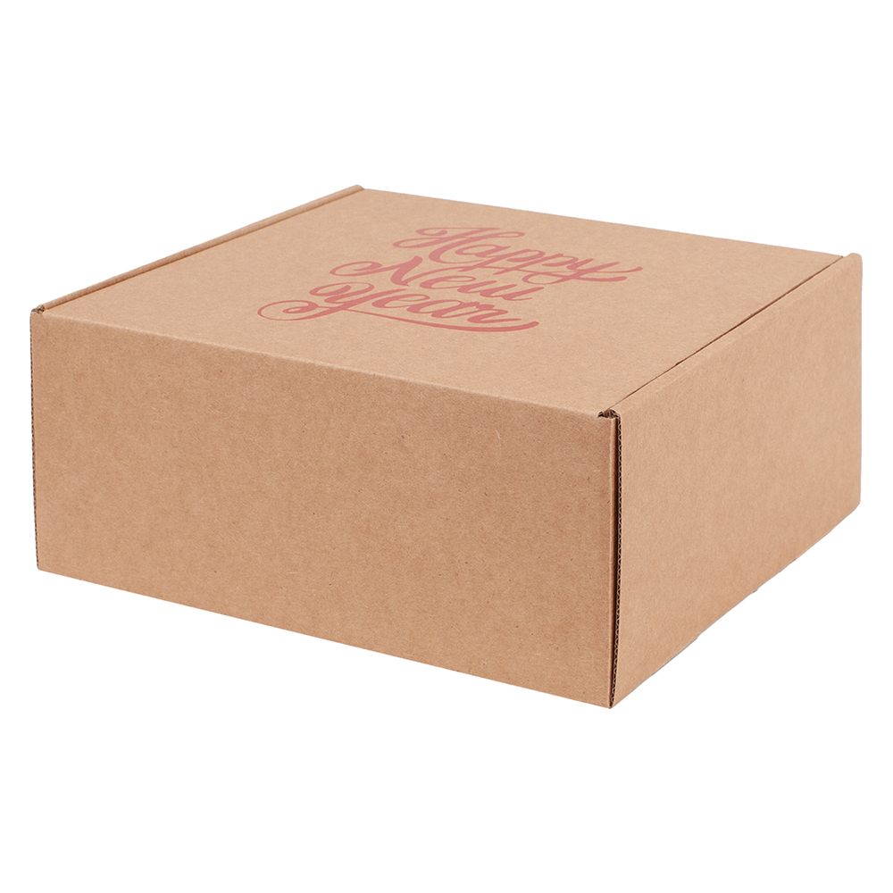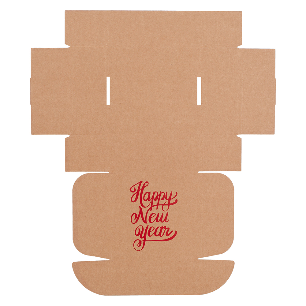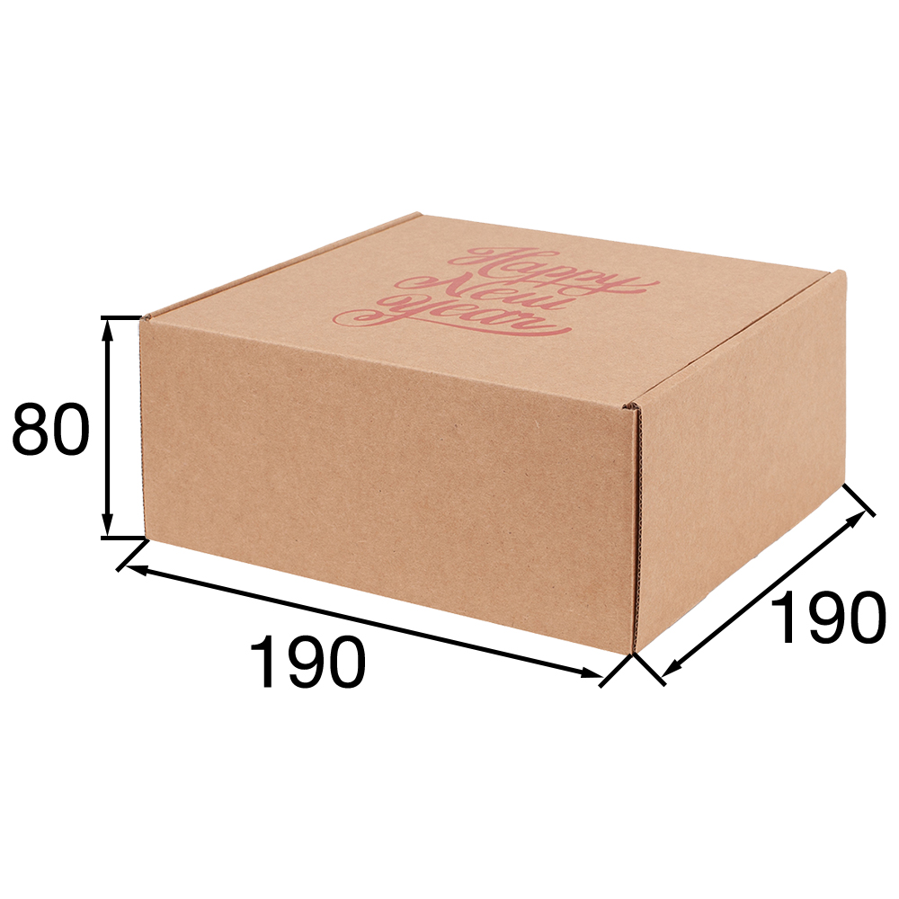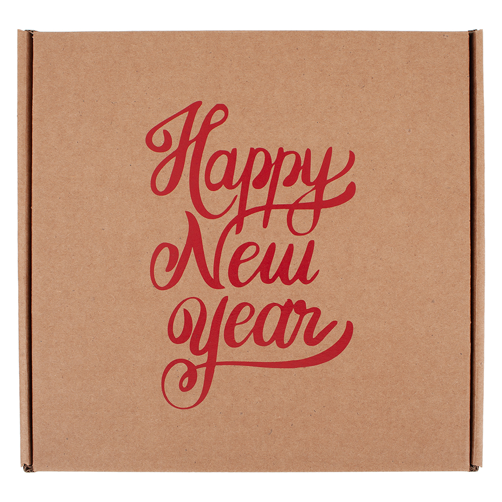 Подарочная коробка «Happy New year» бурого цвета, с красным принтом, длиной 190 мм, шириной 190 мм и высотой 80 мм. Изготовлена из микрогофрокартона Т-23 Е. Полезный объём — 2.89 л.