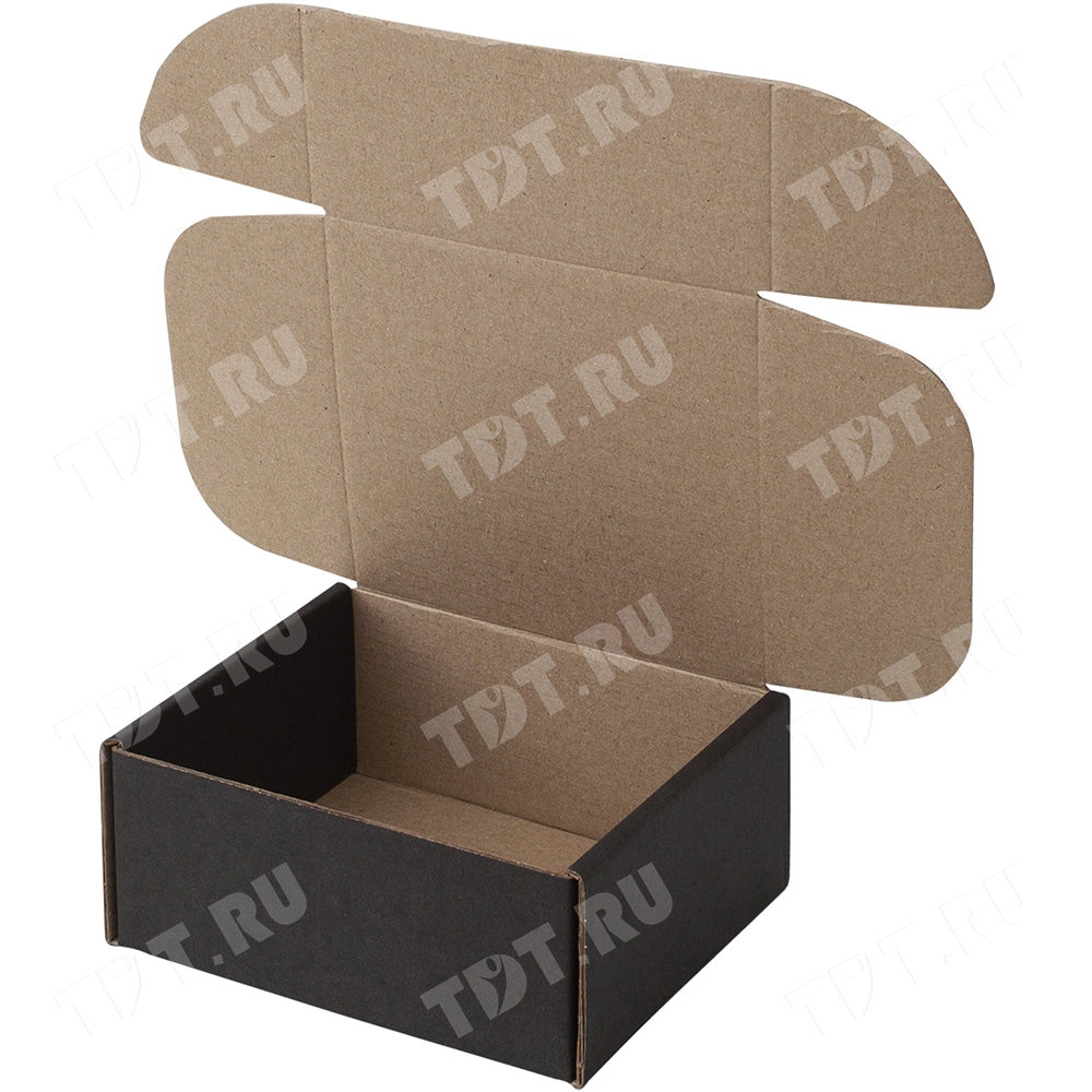 Короб КС-507 МГФ, серии КС-500, чёрный, длиной 125 мм, шириной 110 мм и высотой 55 мм. Изготовлен из картона марки Т-24 В. Полезный объём — 0.75 л.
