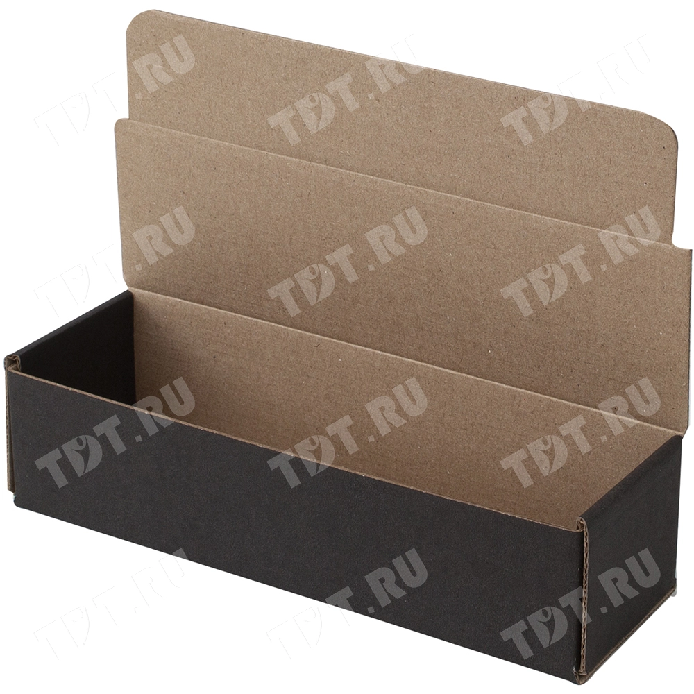 Короб КС-509 МГФ, серии КС-500, чёрный, длиной 200 мм, шириной 60 мм и высотой 50 мм. Изготовлен из картона марки Т-24 В. Полезный объём — 0.6 л.