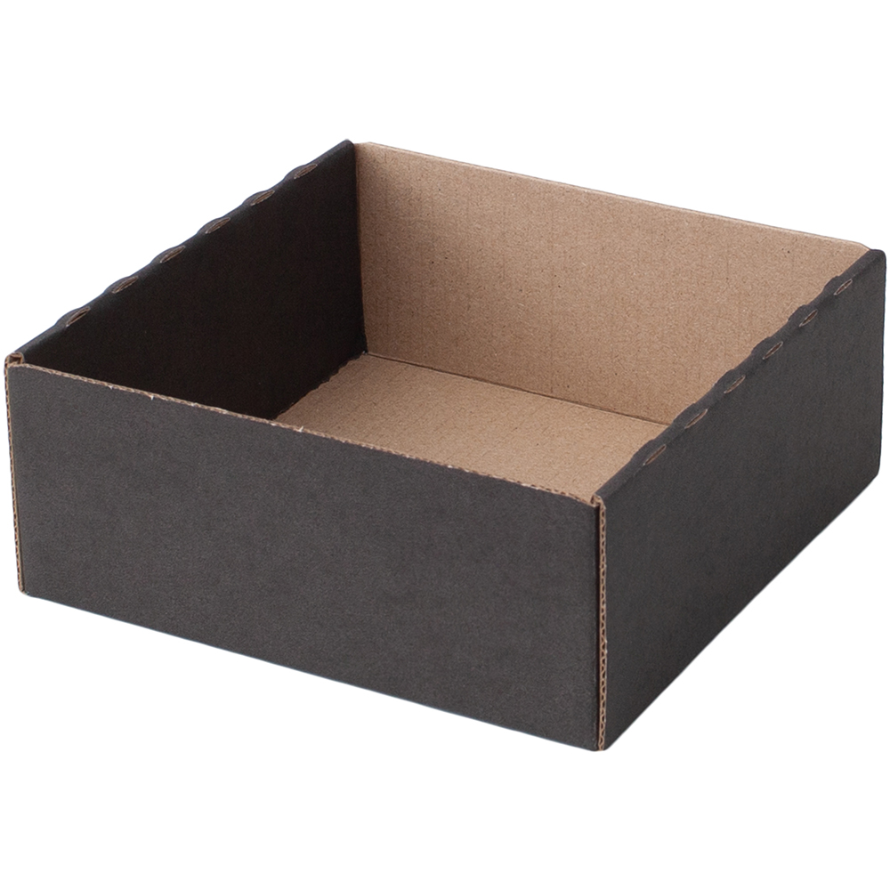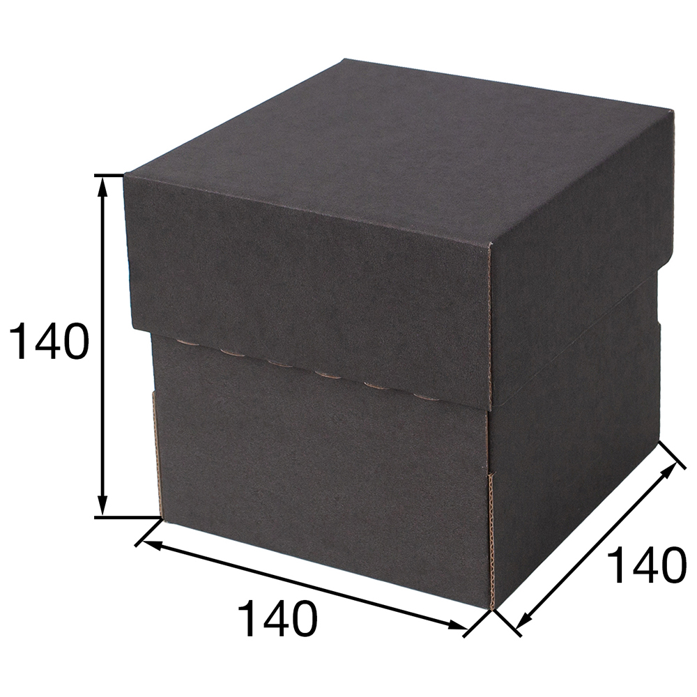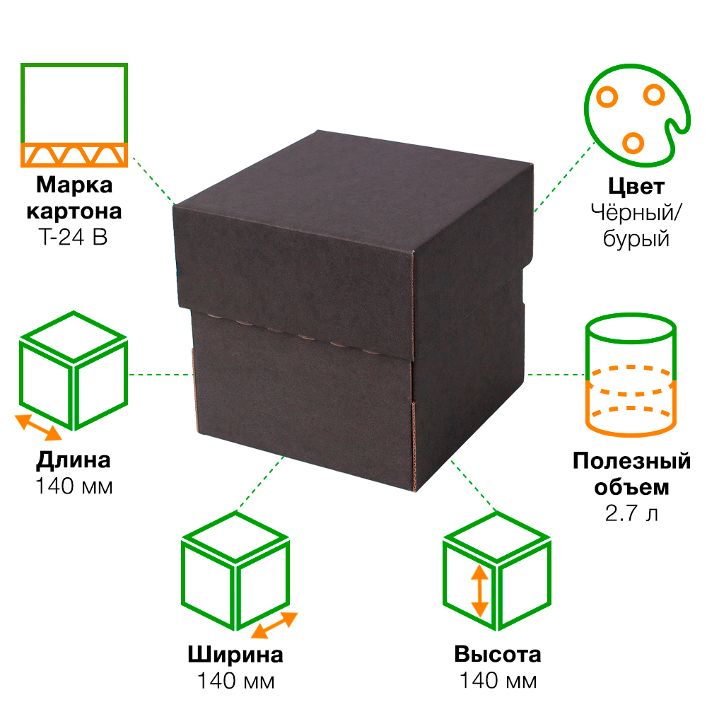 Коробка крышка-дно «Кубик» чёрного цвета, серия КС-500, длиной 140 мм, шириной 140 мм и высотой 140 мм. Изготовлена из картона марки Т-24 В. Полезный объём — 2.7 л.