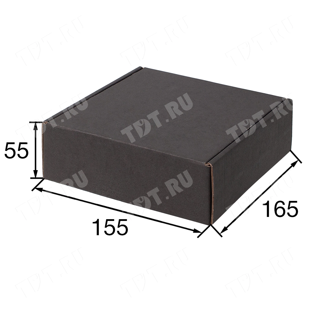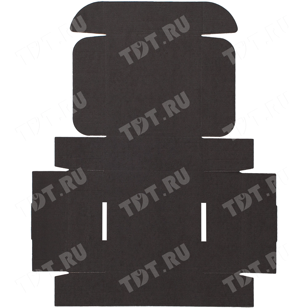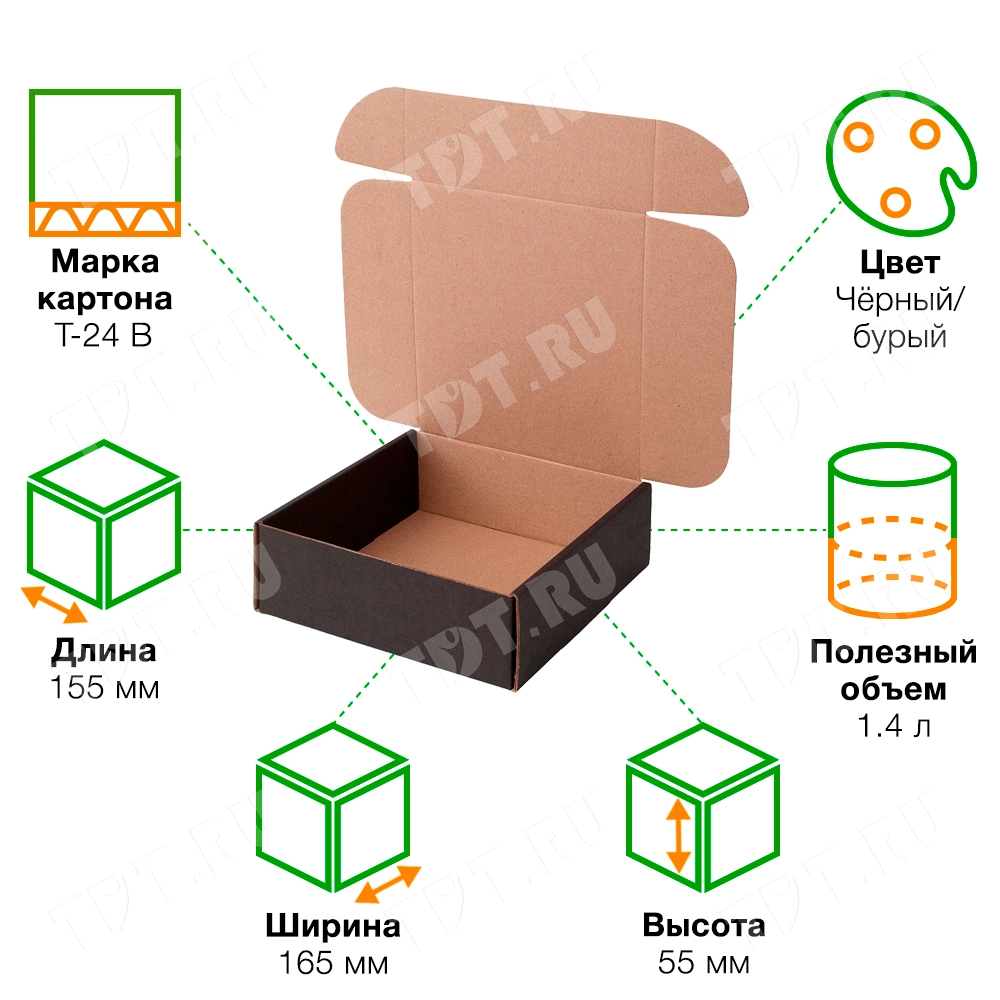 Короб КС-522 МГФ, серии КС-500, чёрный, длиной 155 мм, шириной 165 мм и высотой 55 мм. Изготовлен из картона марки Т-24 В. Полезный объём — 1.4 л.