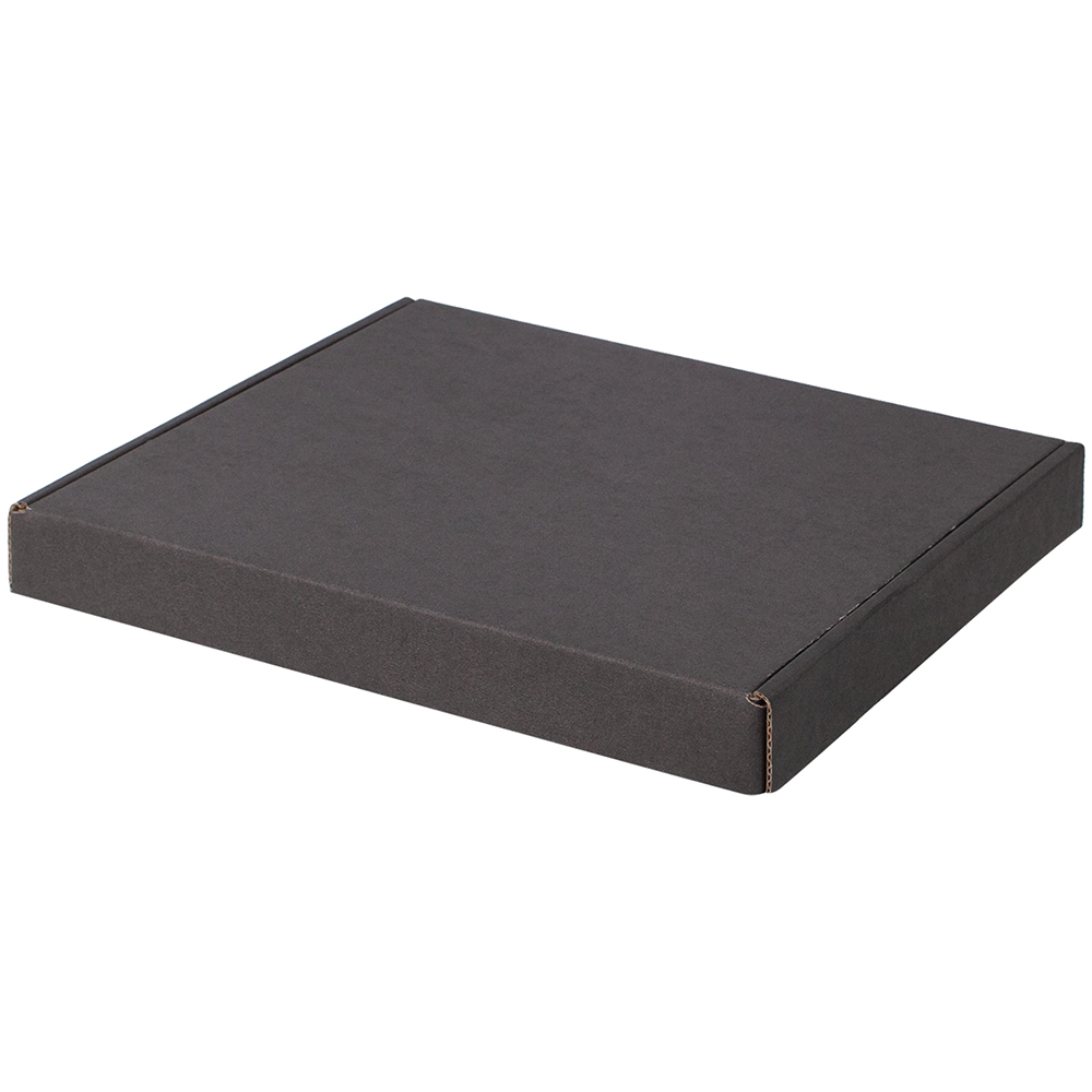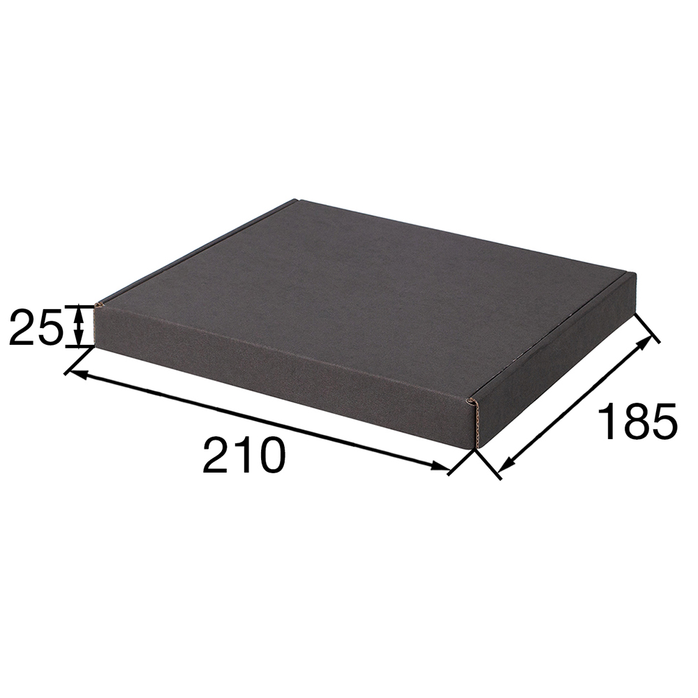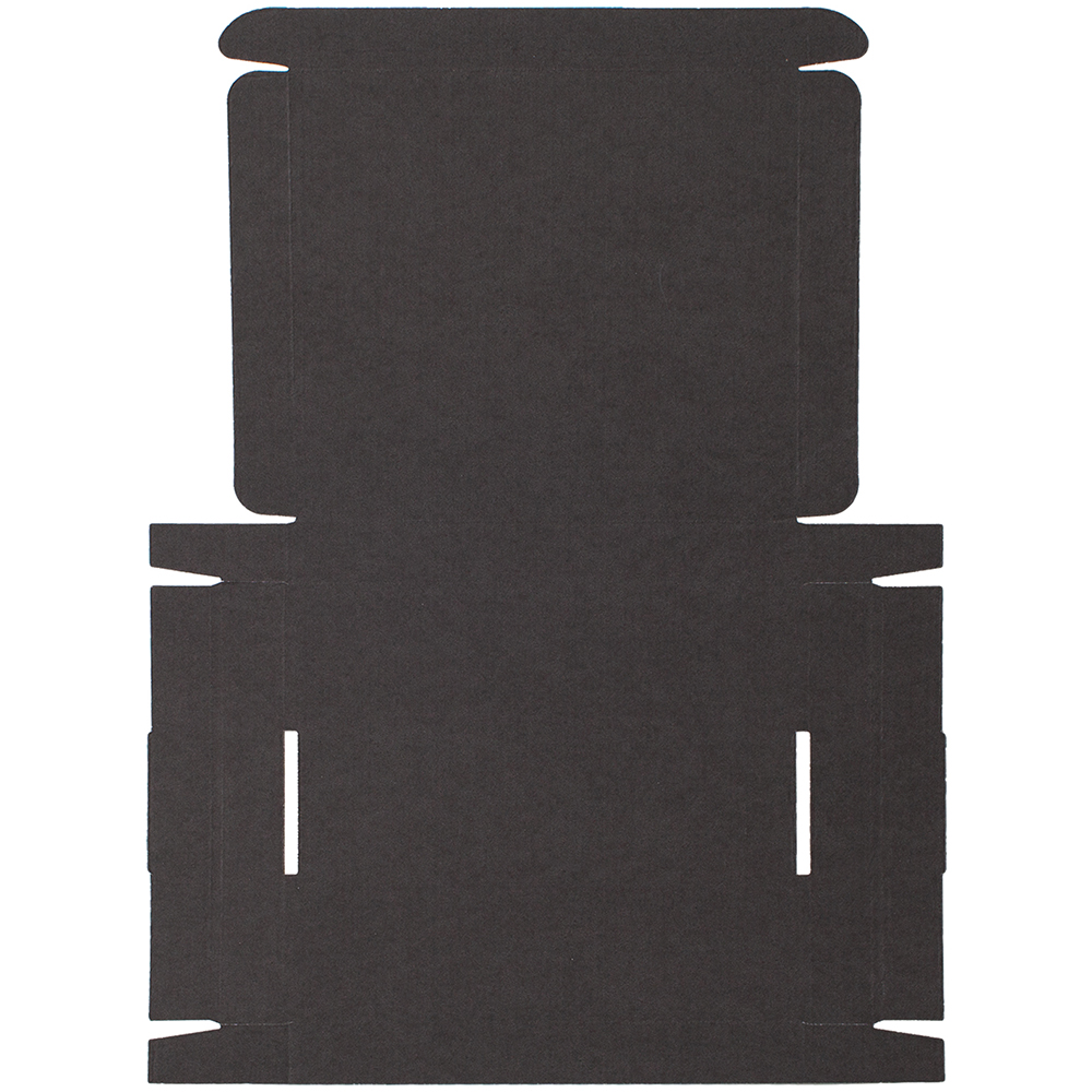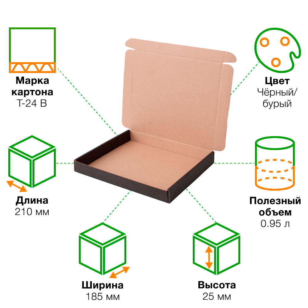 Короб КС-535 МГФ, серии КС-500, чёрный, длиной 210 мм, шириной 185 мм и высотой 25 мм. Изготовлен из картона марки Т-24 В. Полезный объём — 0.95 л.