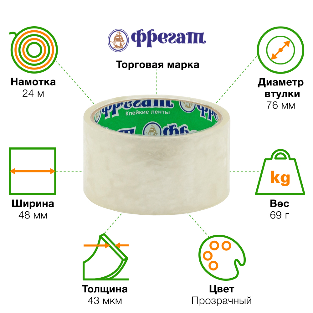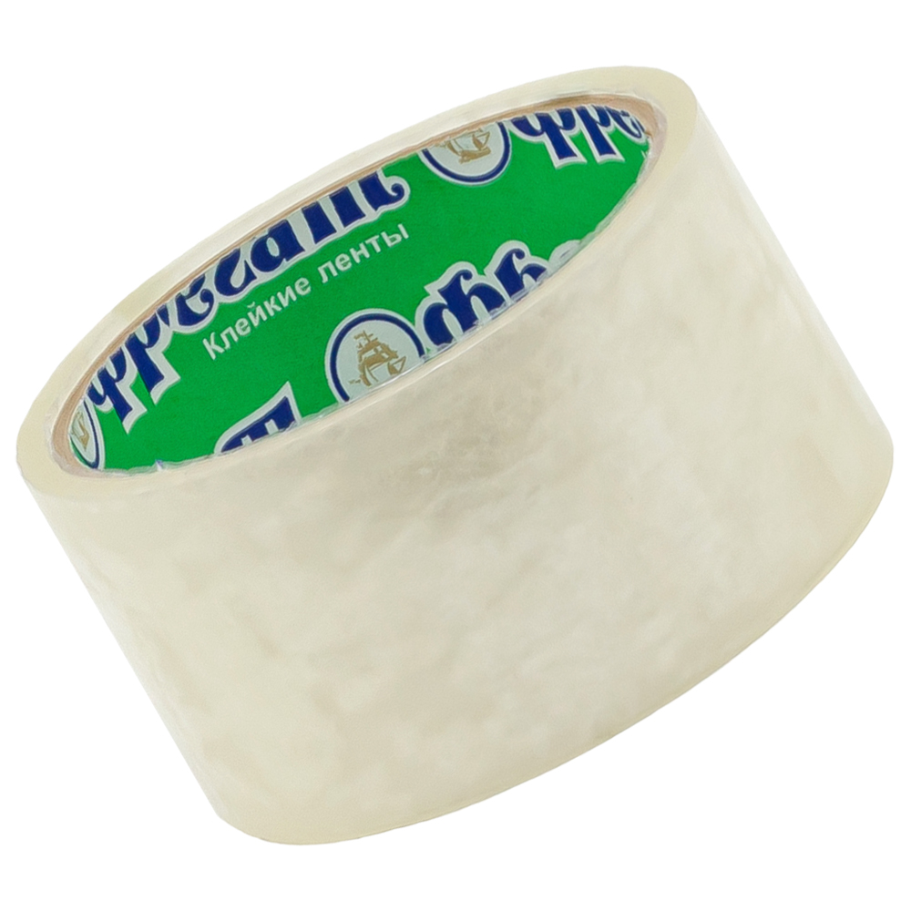 Клейкая лента прозрачная шириной 48 мм, диаметром втулки 76 мм, намоткой 24 метра для ручной упаковки Фрегат. Изготовлена на основе полипропилена.