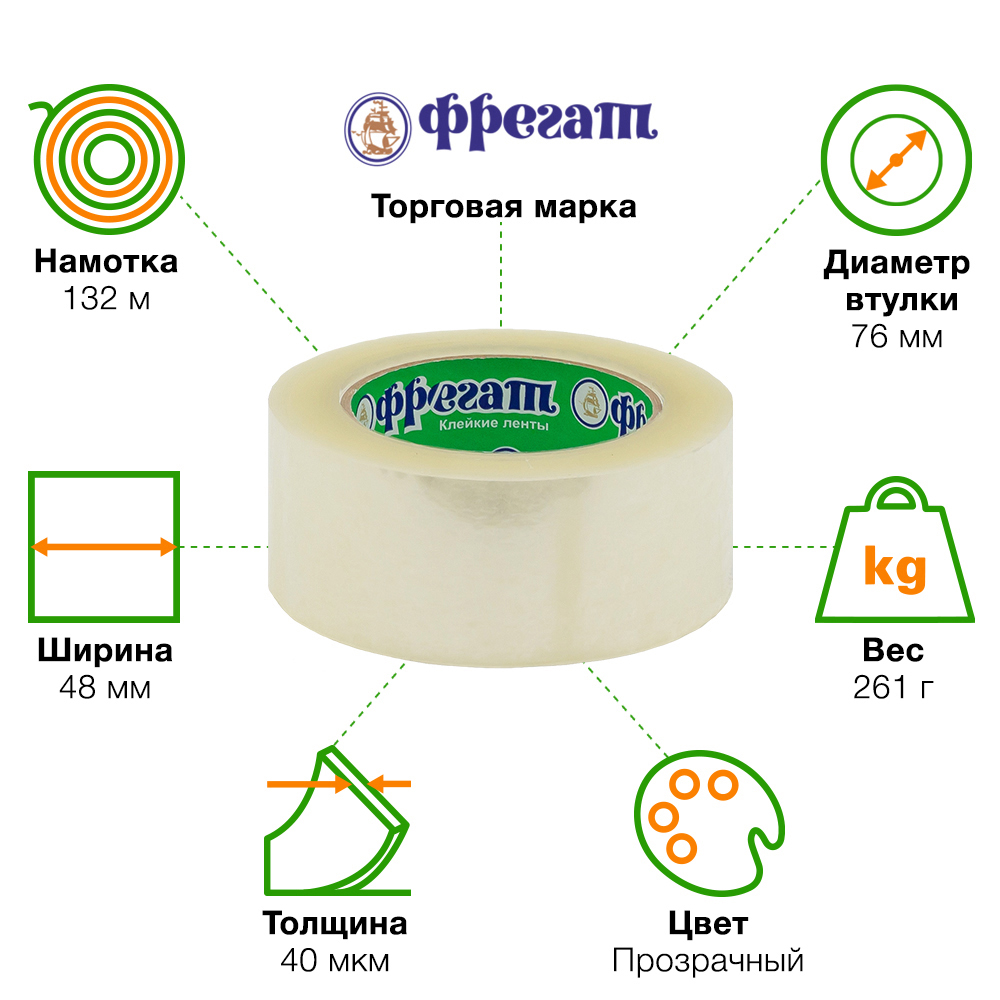 Клейкая лента прозрачная шириной 48 мм, диаметром втулки 76 мм, намоткой 132 метра для ручной упаковки Фрегат. Изготовлена на основе полипропилена.