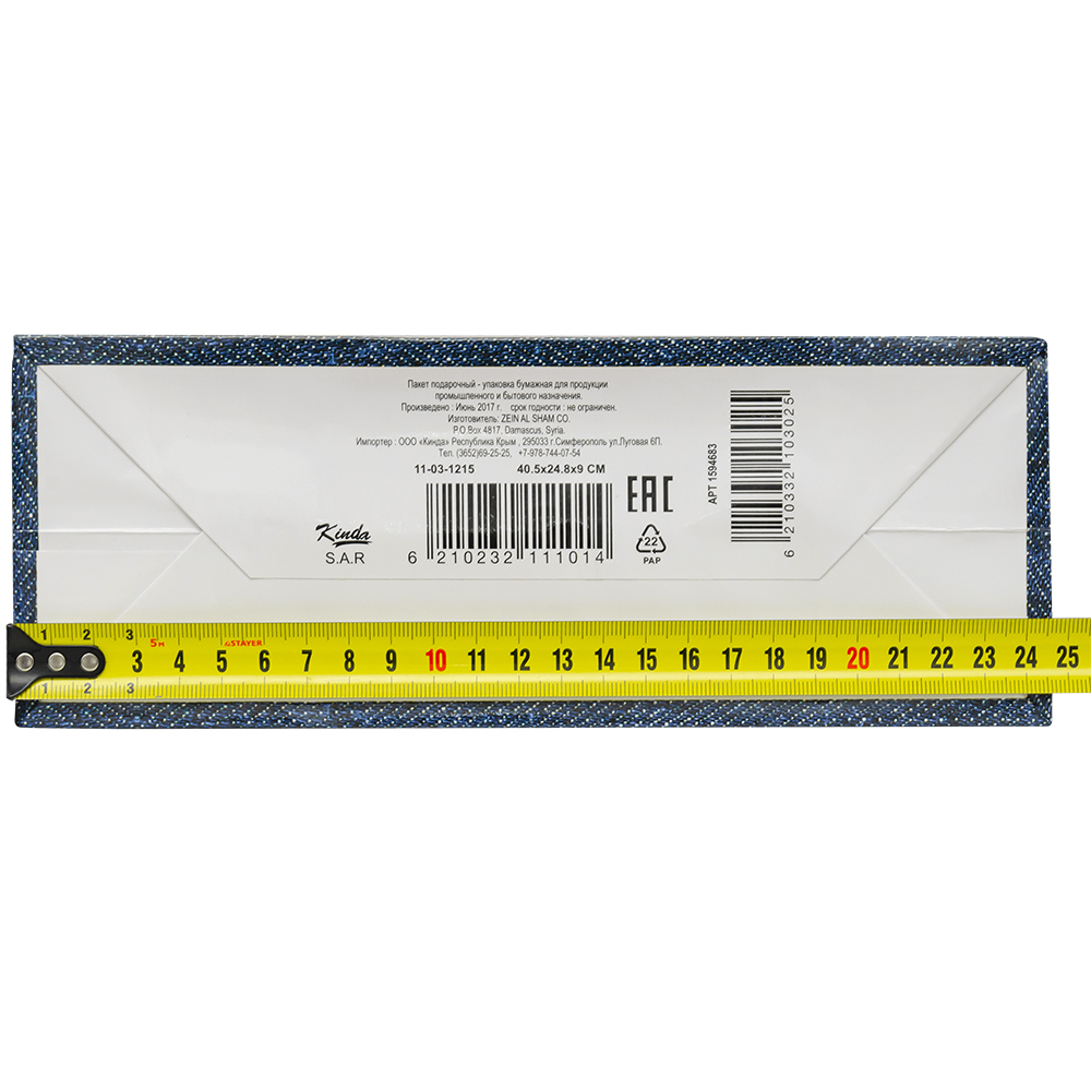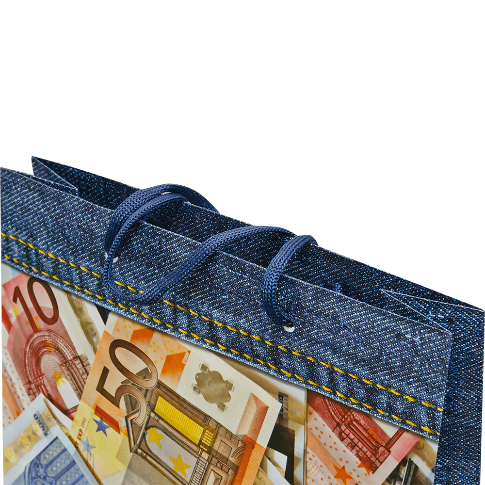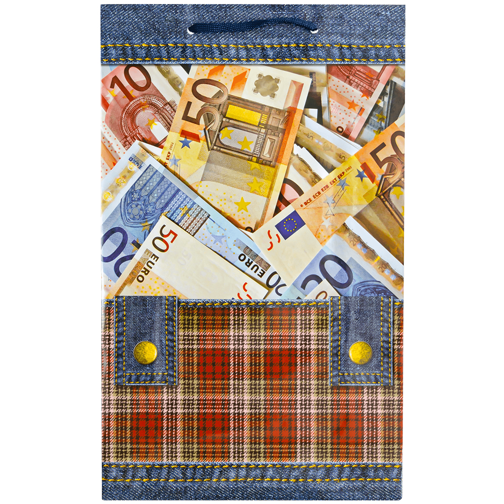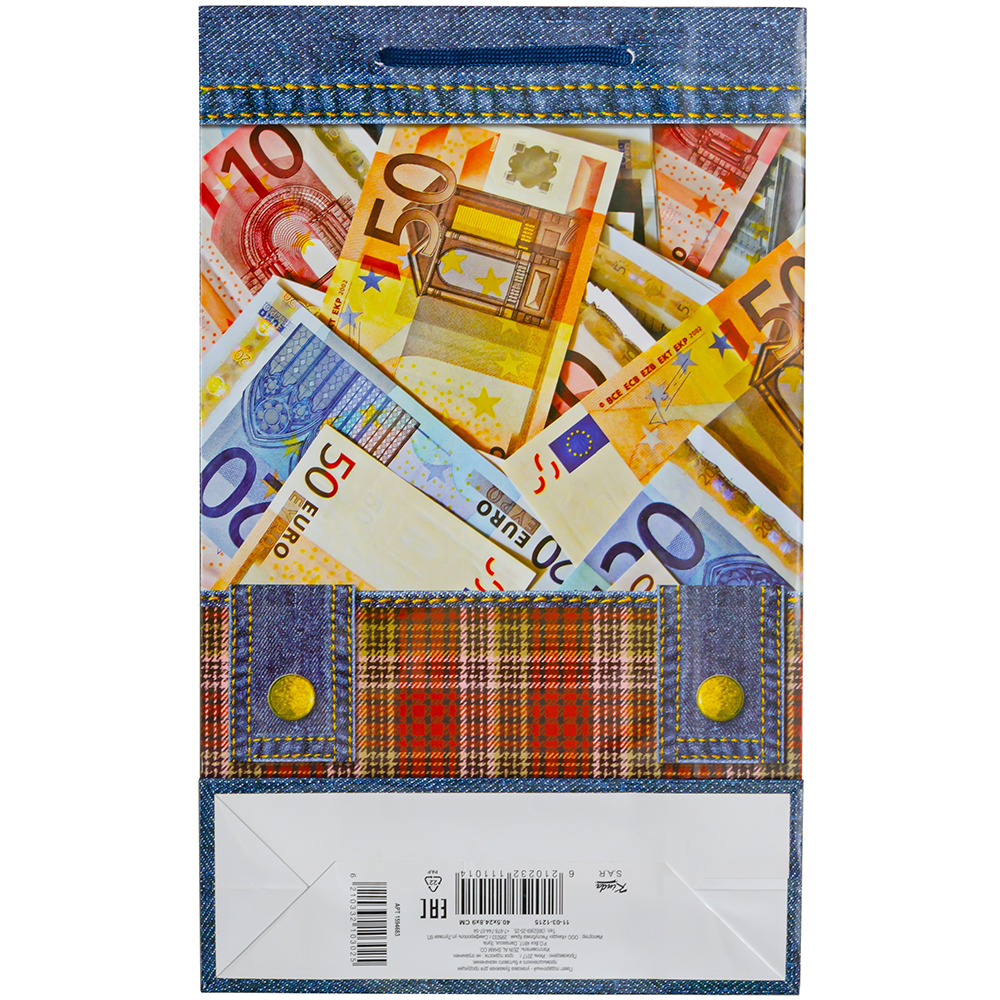 Ламинированный подарочный пакет с ручками «Джинса и евро» шириной 90 мм, длиной 248 мм, высотой 405 мм.
