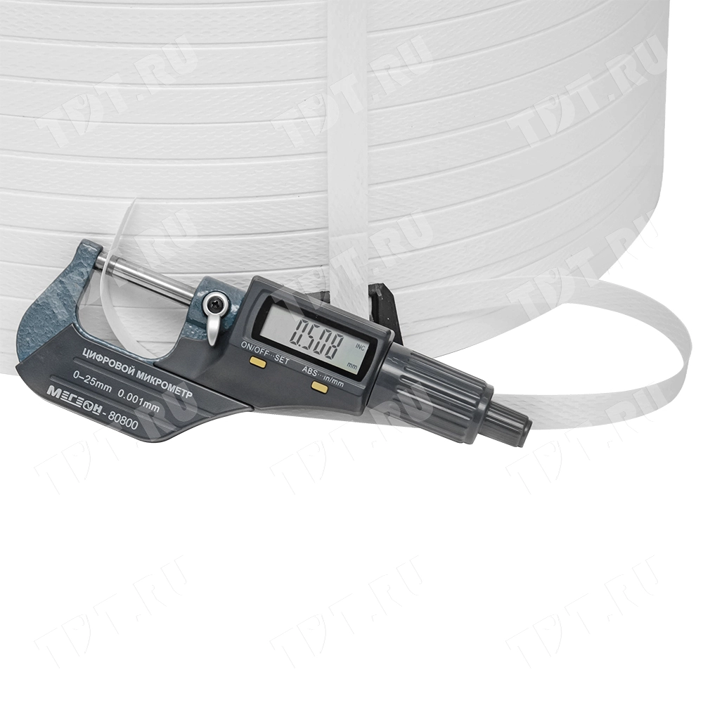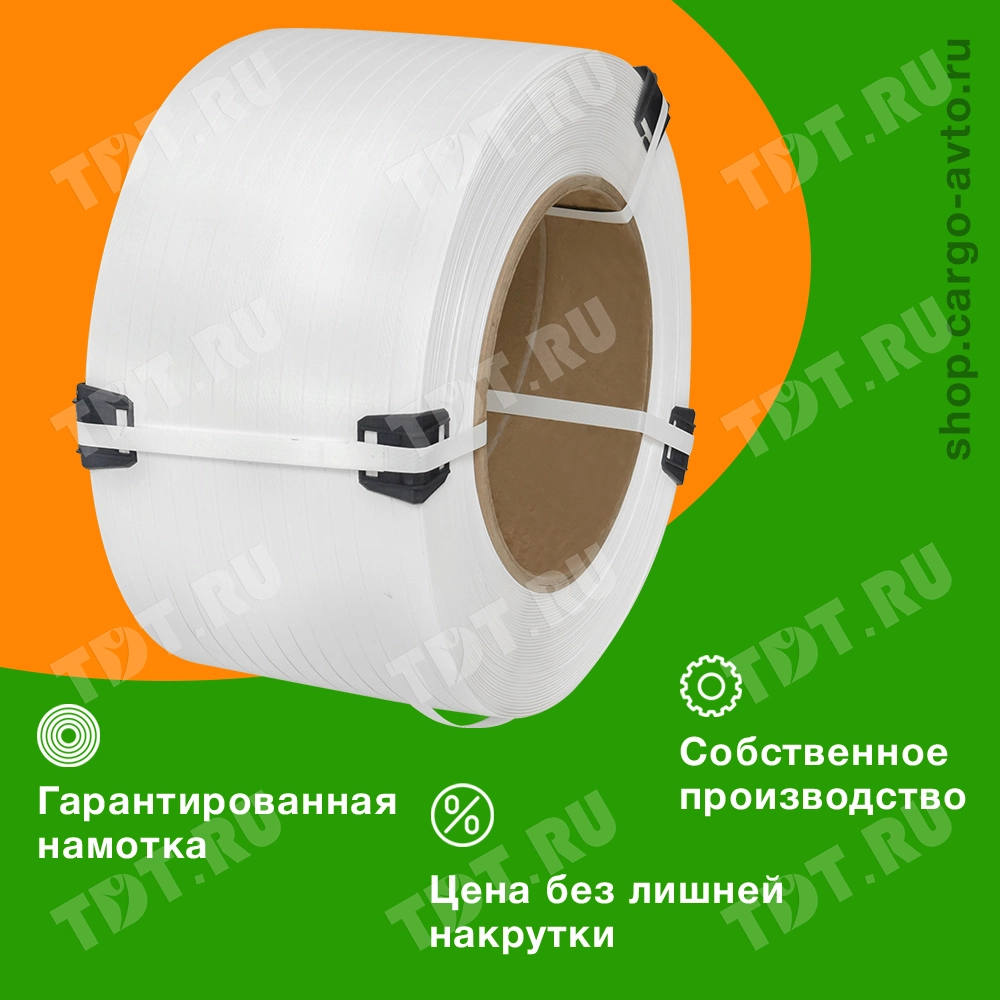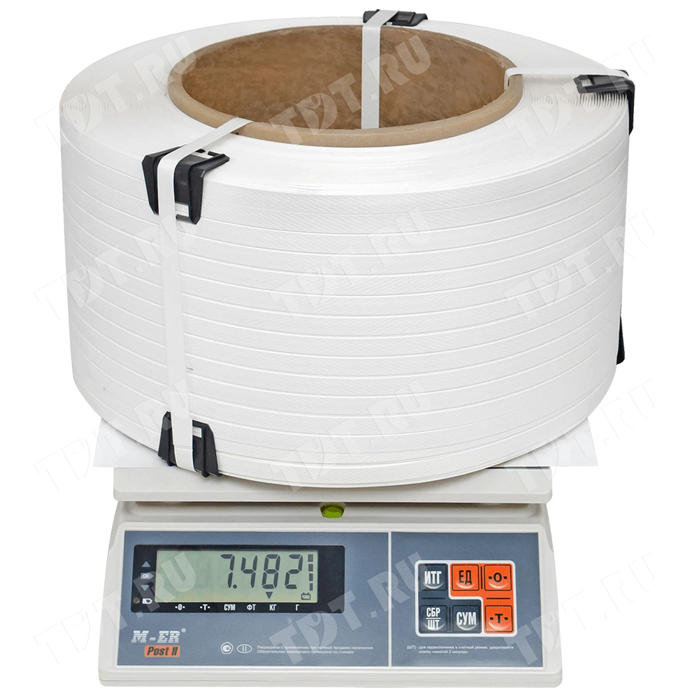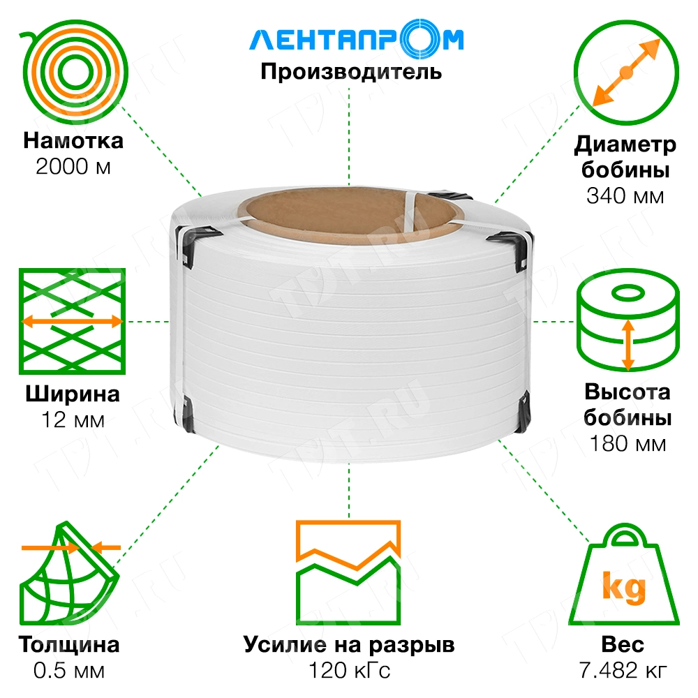 Упаковочная полипропиленовая лента (ПП) Лентапром, белого цвета, намоткой 2000 м, шириной 12 мм, толщиной 0,5 мм, усилием на разрыв 120 кГс, весом 7.482 кг, транспортировочным объемом 0.020808 м³. Диапазон рабочих температур от -30 до +60°C. Производится в России.