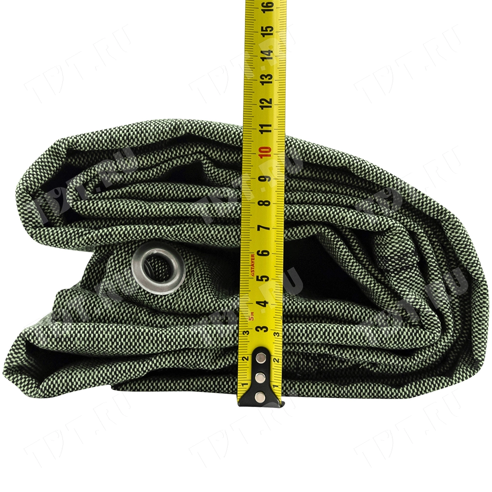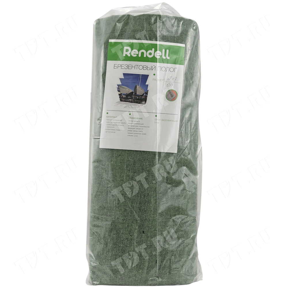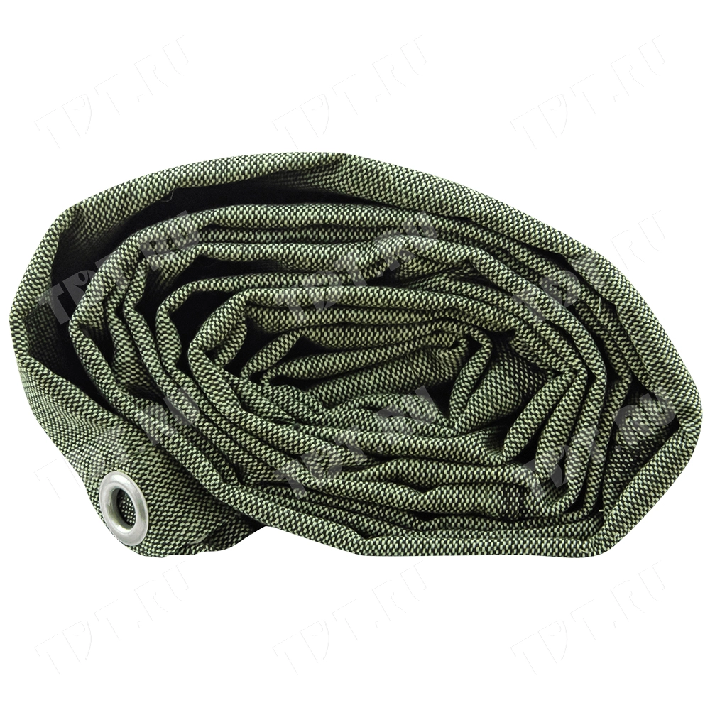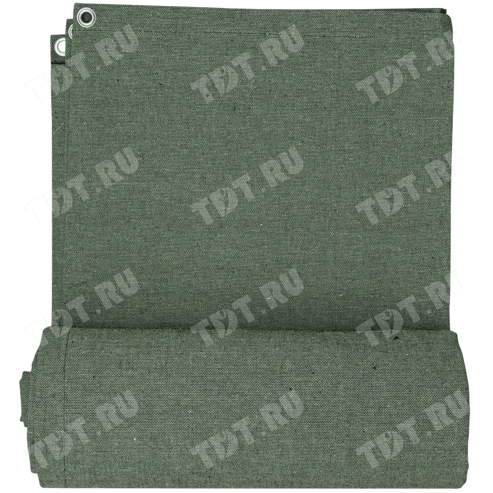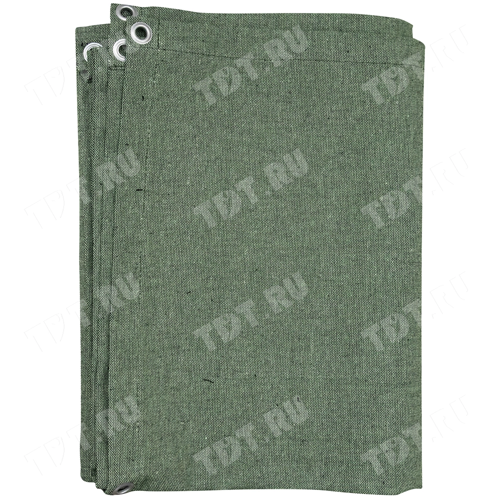Огнеупорный брезент с люверсами Rendell, цвета хаки, длиной 3 м, шириной 2 м, площадью 6 м², плотностью 400 г/м², расстоянием между люверсами 50 см, весом 2.487 кг. Материал – хлопок, лен и огнеупорная пропитка (ОП). Производится в России.