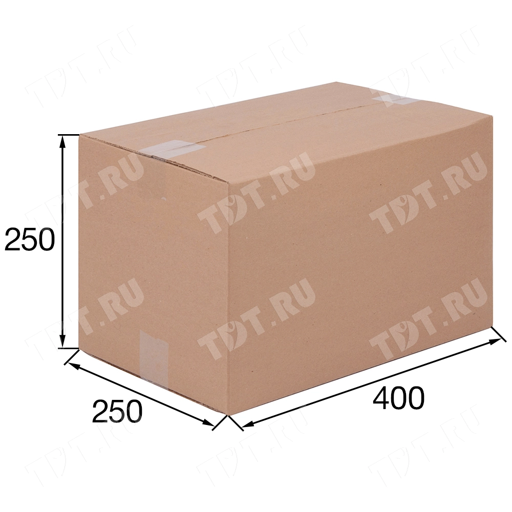 Картонный короб №108 для переезда, длиной 400 мм, шириной 250 мм и высотой 250 мм. Изготовлен из трехслойного картона марки Т-21 В. Полезный объём — 25 л.