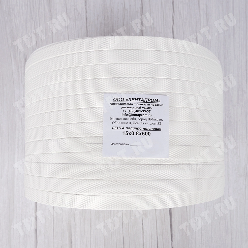 Упаковочная полипропиленовая лента (ПП) Лентапром, белого цвета, намоткой 500 м, шириной 15 мм, толщиной 0,8 мм, усилием на разрыв 240 кГс, весом 3.767 кг, транспортировочным объемом 0.013487 м³. Диапазон рабочих температур от -30 до +60°C. Производится в России.