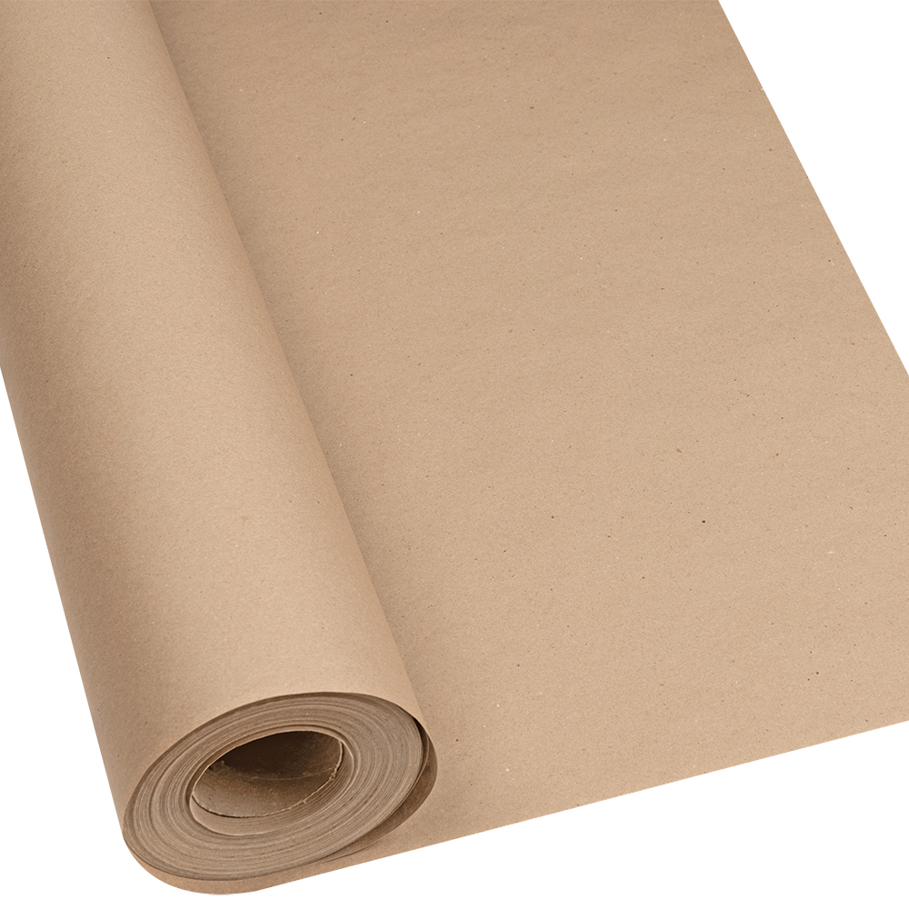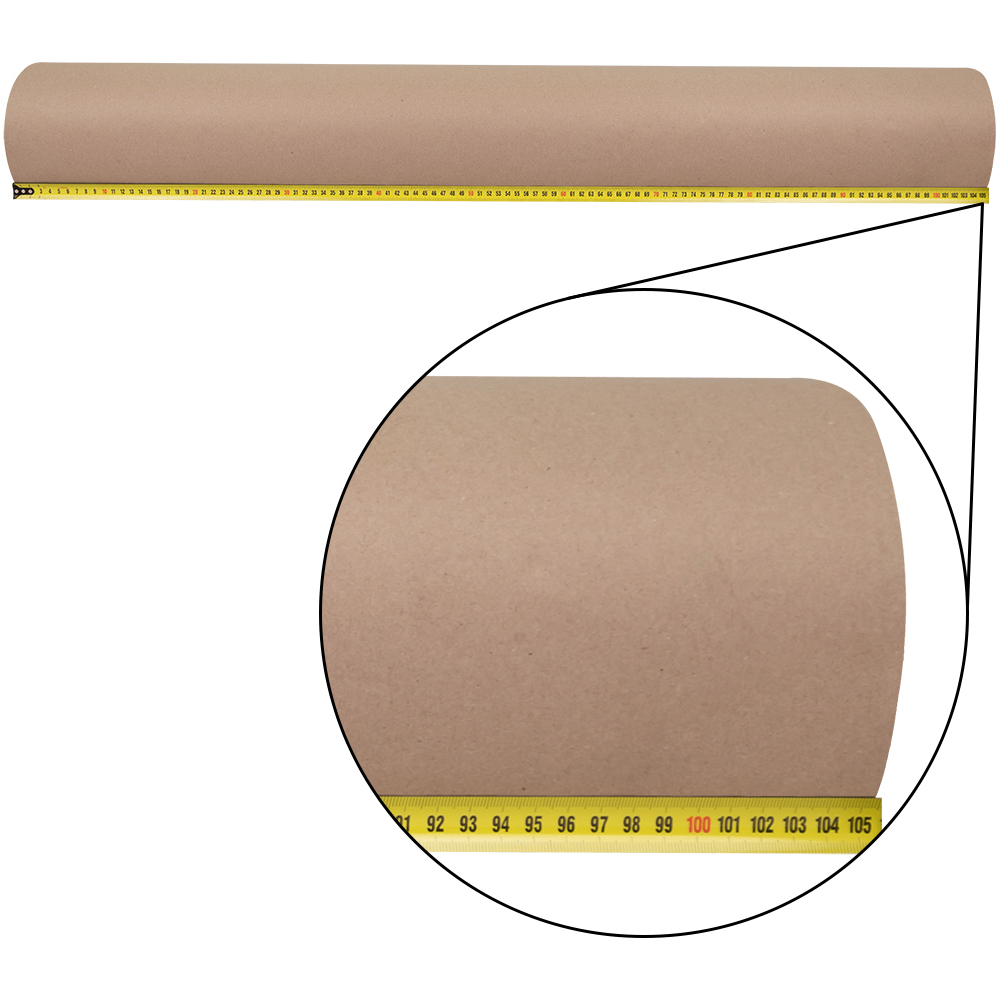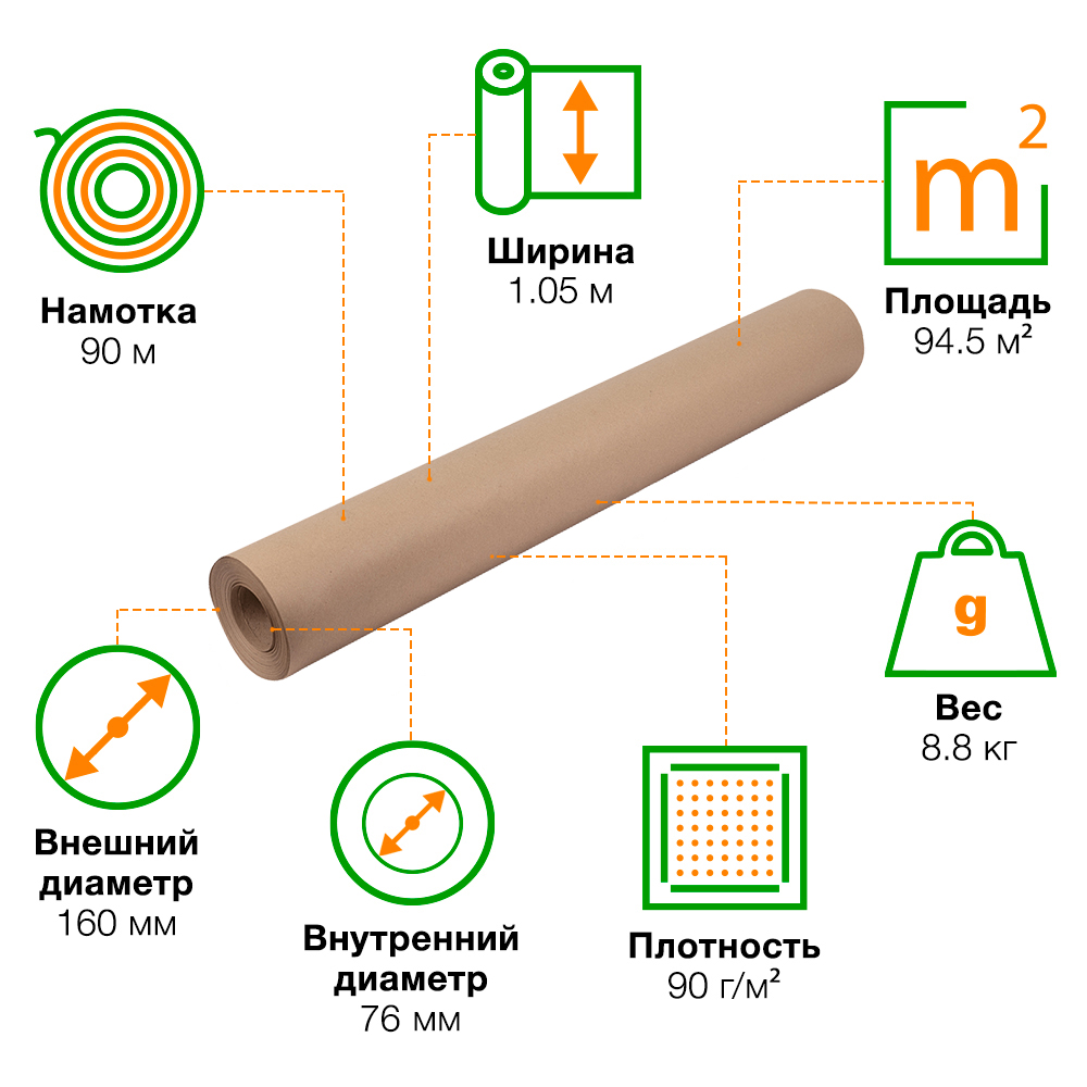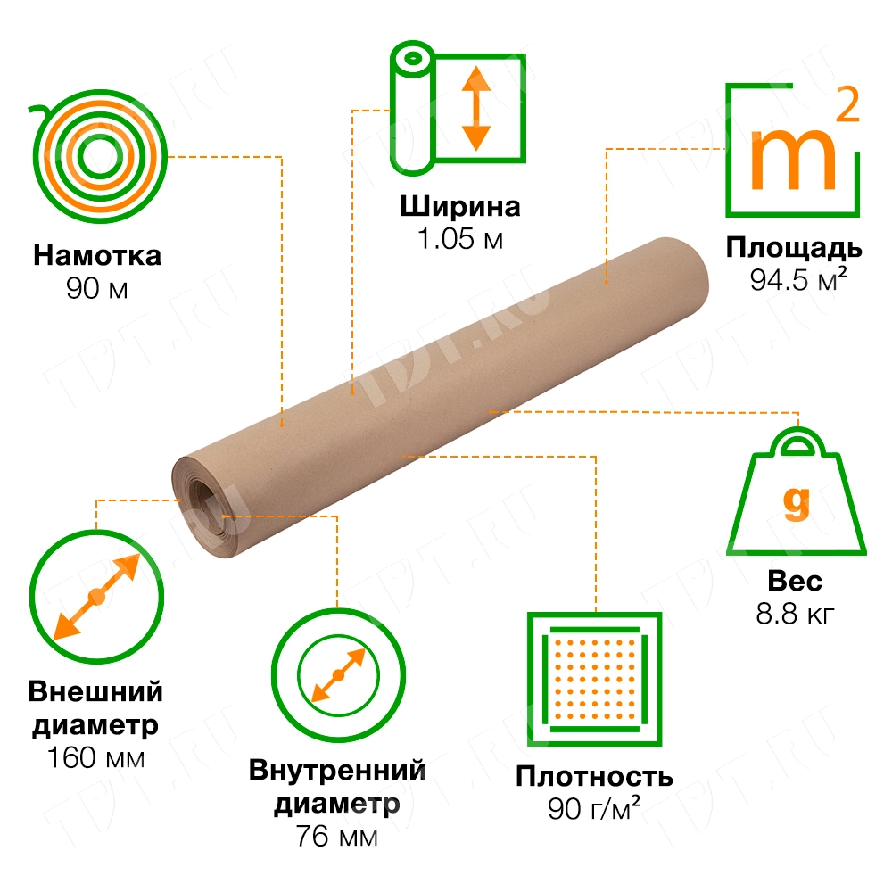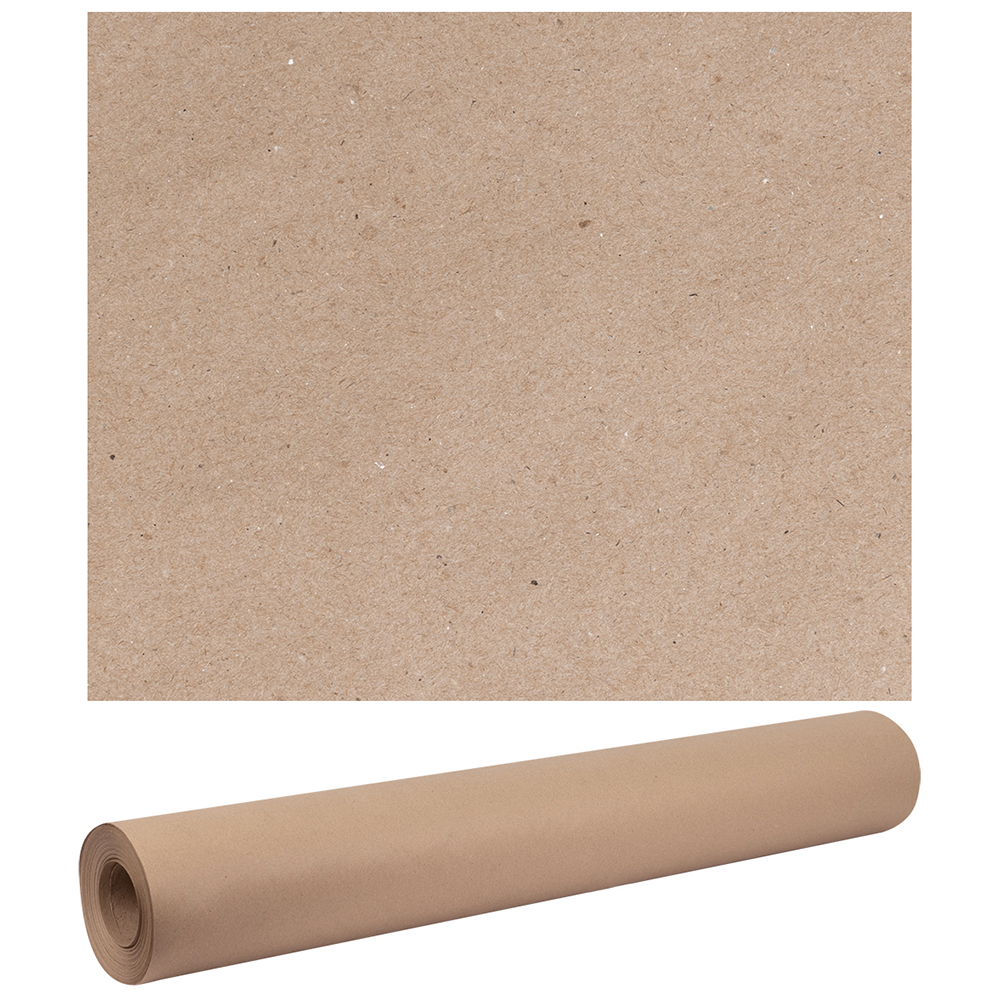 Оберточная крафт бумага в рулоне бурого цвета, шириной 105 см, намоткой 90 м, плотностью 90 г/м². Экологически чистый упаковочный материал из вторсырья. Производится в России.