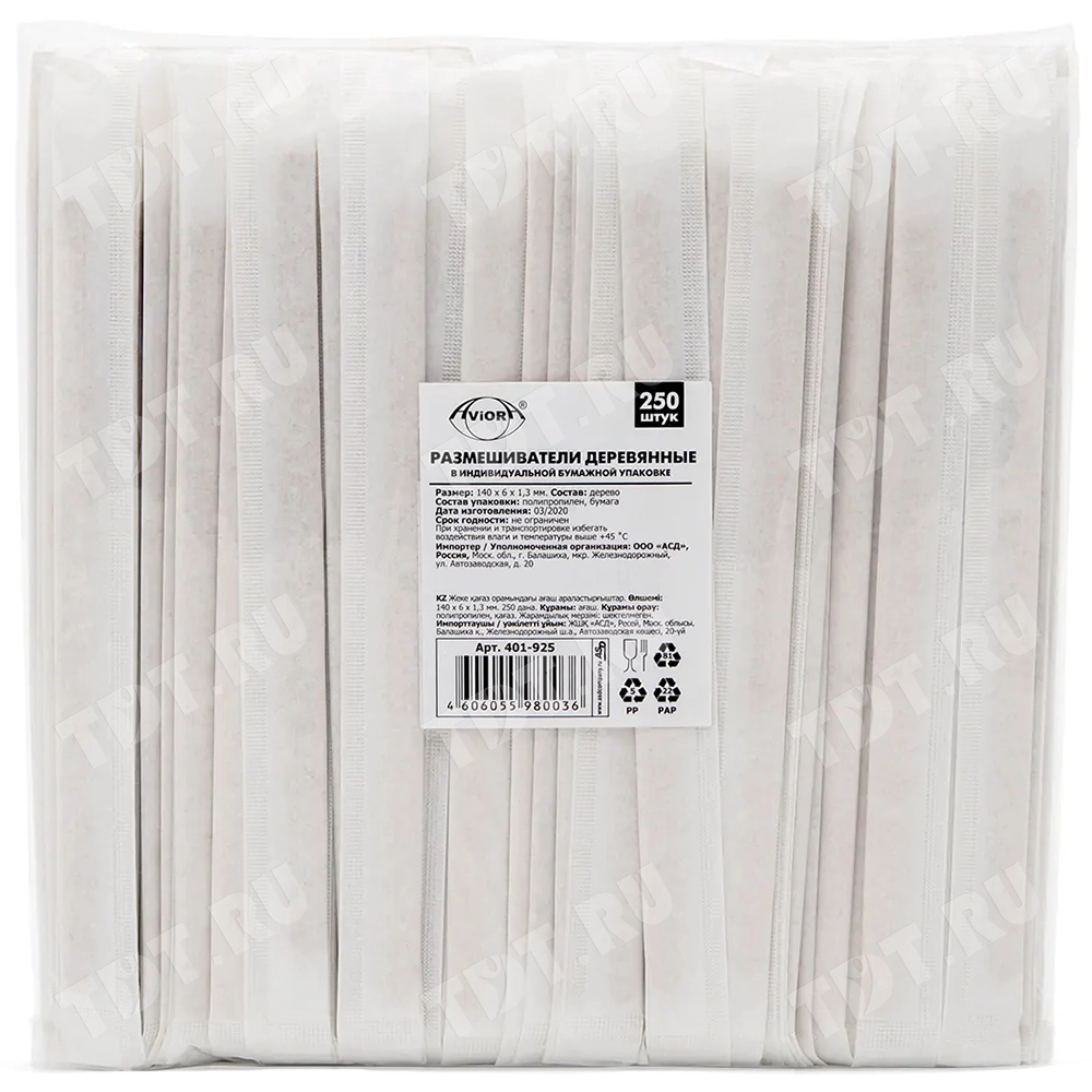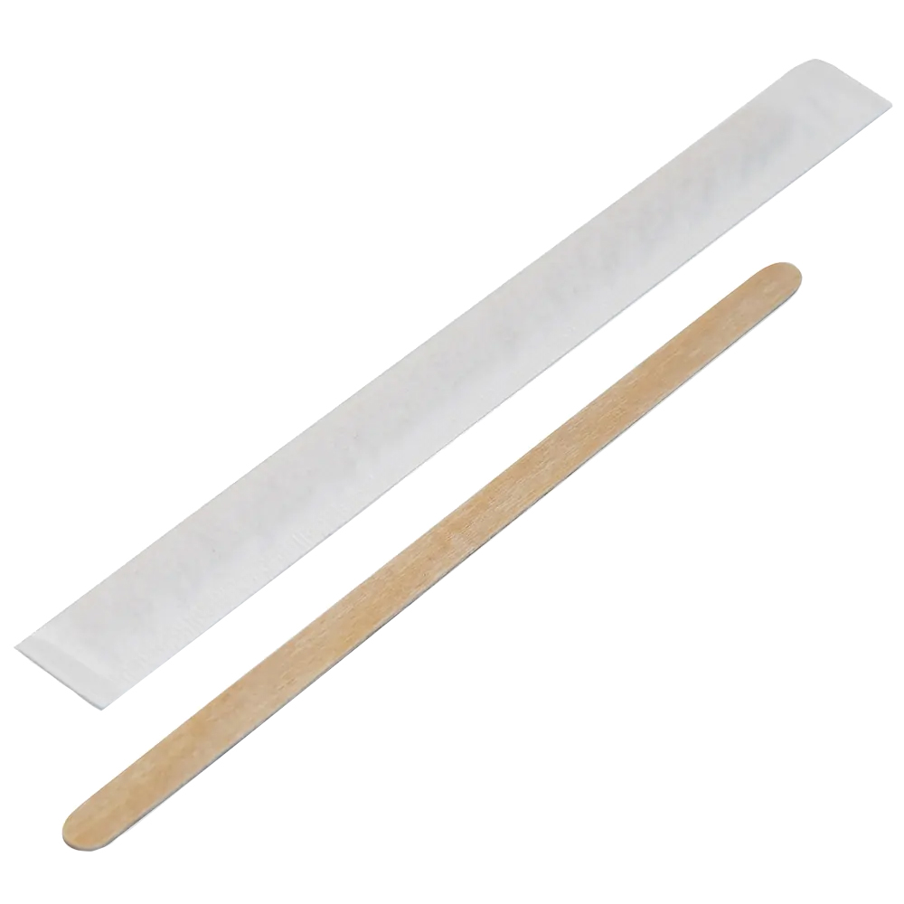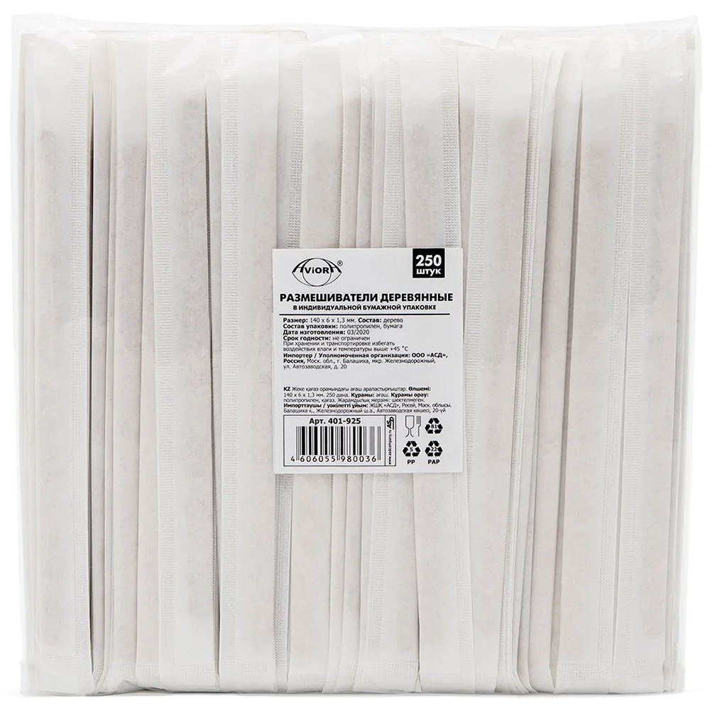 Деревянные размешиватели для напитков в индивидуальной бумажной упаковке Aviora, диной 140 мм, шириной, 6 мм, высотой 1.3 мм, в упаковке по 250 шт.