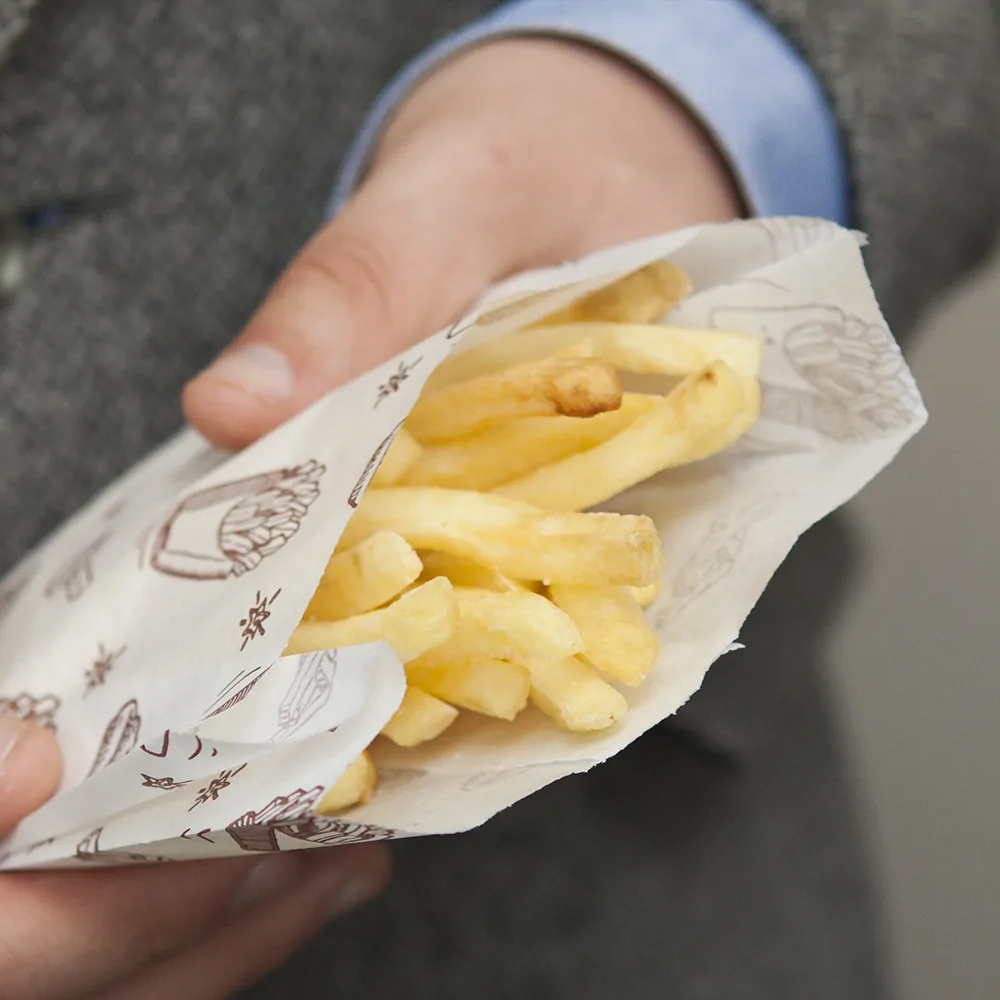 Бумажные пакеты под картошку фри, с рисунком, без ручек, белого цвета, высотой 175 мм, шириной 110 мм, плотностью 35 г/м², в упаковке по 100 штук. Материал – жиростойкая бумага. Производятся в России.