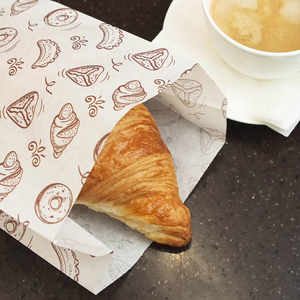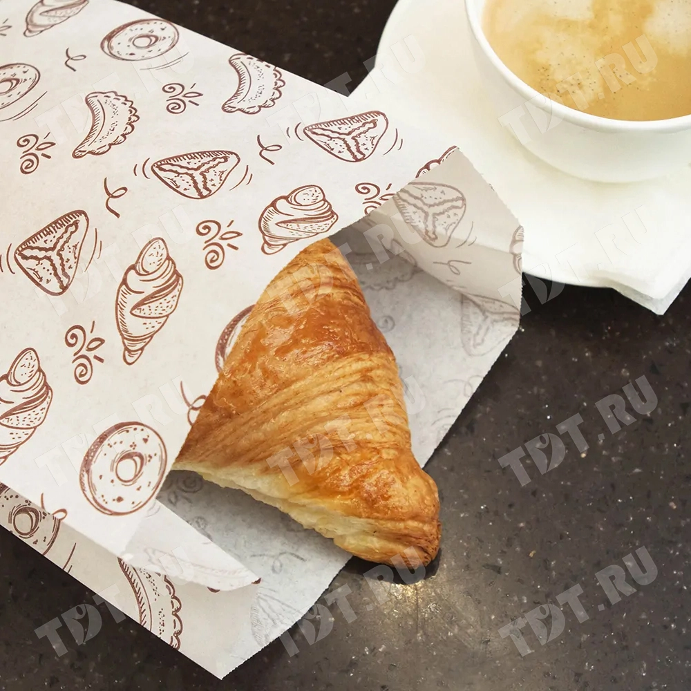 Бумажные крафт пакеты под выпечку, с рисунками, без ручек, белого цвета, высотой 250 мм, шириной 140 мм, плотностью 35 г/м², в упаковке по 100 штук. Материал – жиростойкая бумага. Производятся в России.