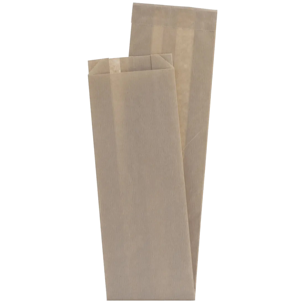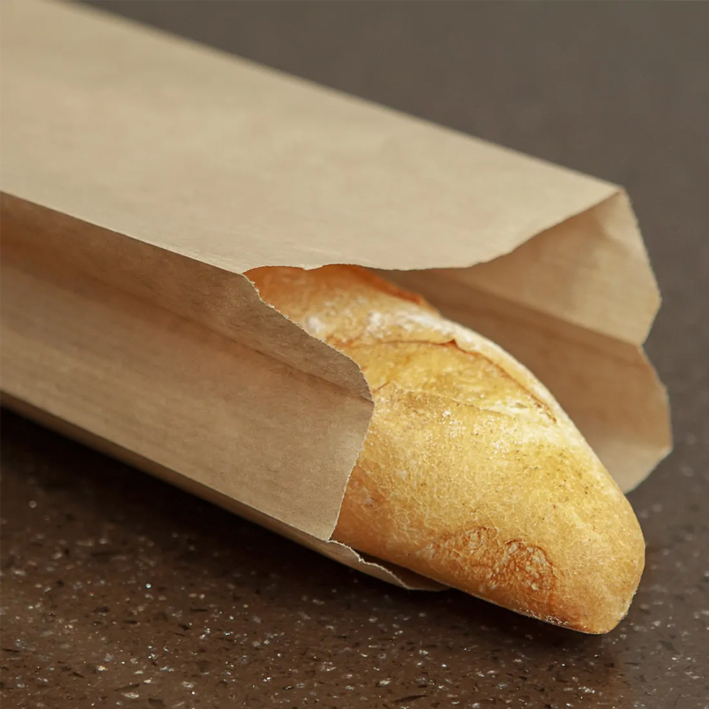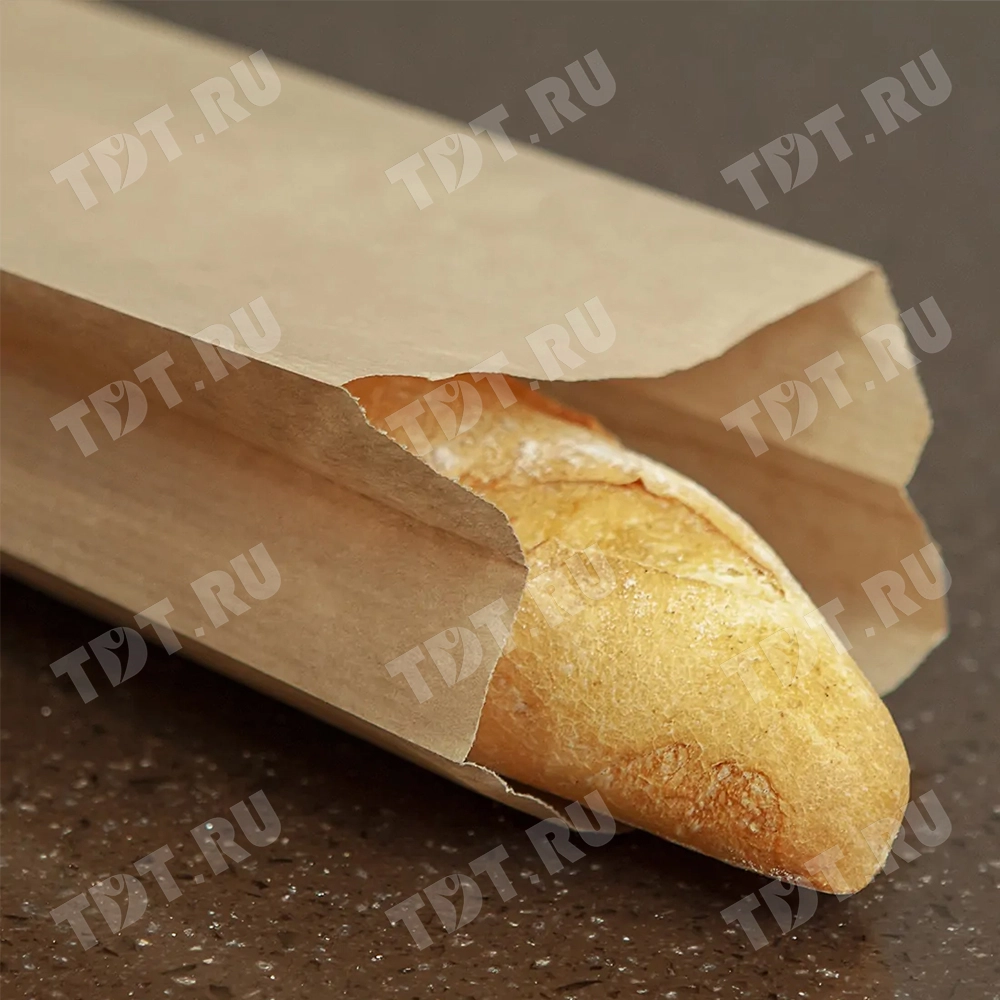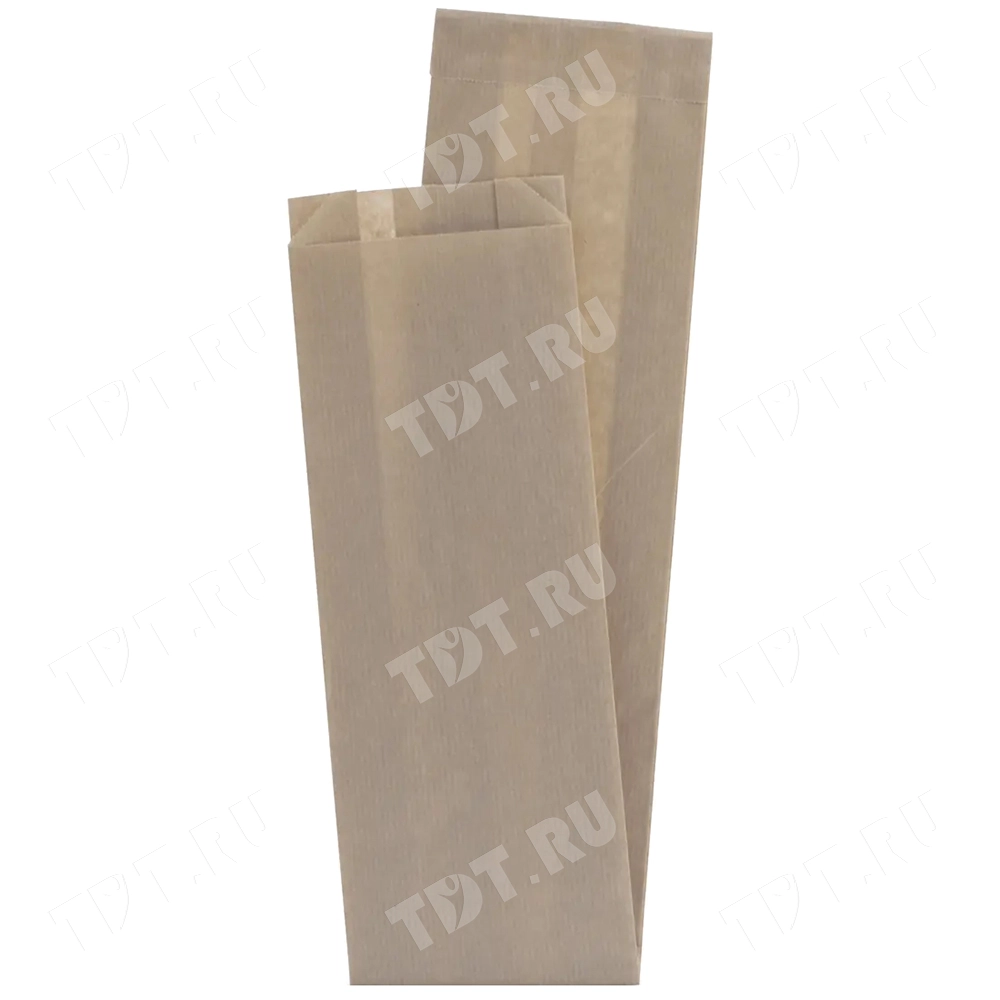 Бумажные крафт пакеты под французские багеты, без ручек, коричневого цвета, высотой 640 мм, шириной 100 мм, плотностью 40 г/м², в упаковке по 100 штук. Материал – бумага. Производятся в России.