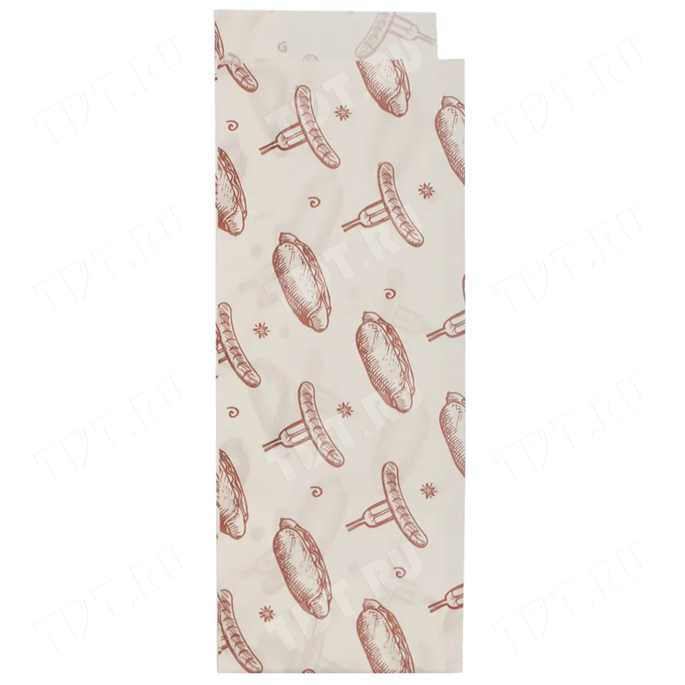 Бумажные пакеты под хот-доги, с рисунком, без ручек, белого цвета, высотой 175 мм, шириной 110 мм, плотностью 40 г/м², в упаковке по 100 штук. Материал – влагопрочная бумага. Производятся в России.