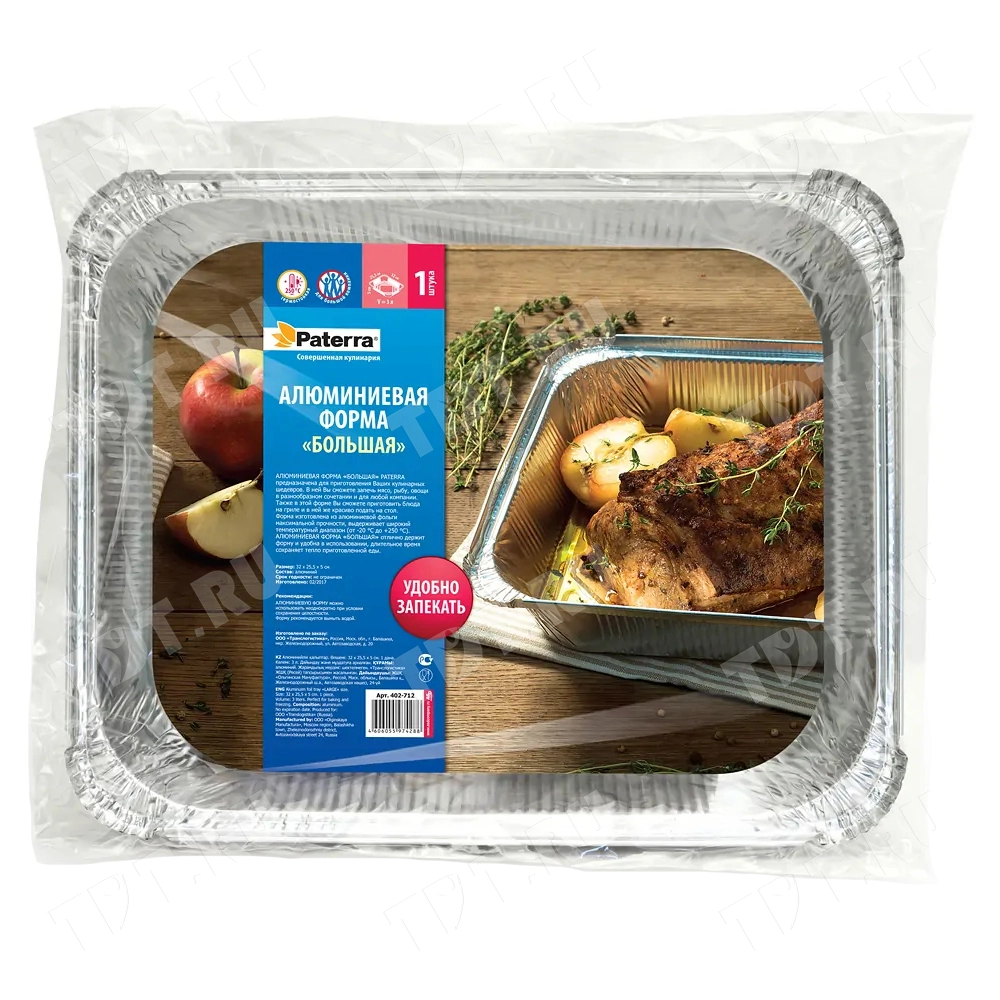 Большие одноразовые алюминиевые формы «Paterra» прямоугольные, объемом 3 л, длиной 32 см, шириной 25.5 см, высотой 5 см, в упаковке по 1 штуке. Материал – алюминий. Производятся в России.