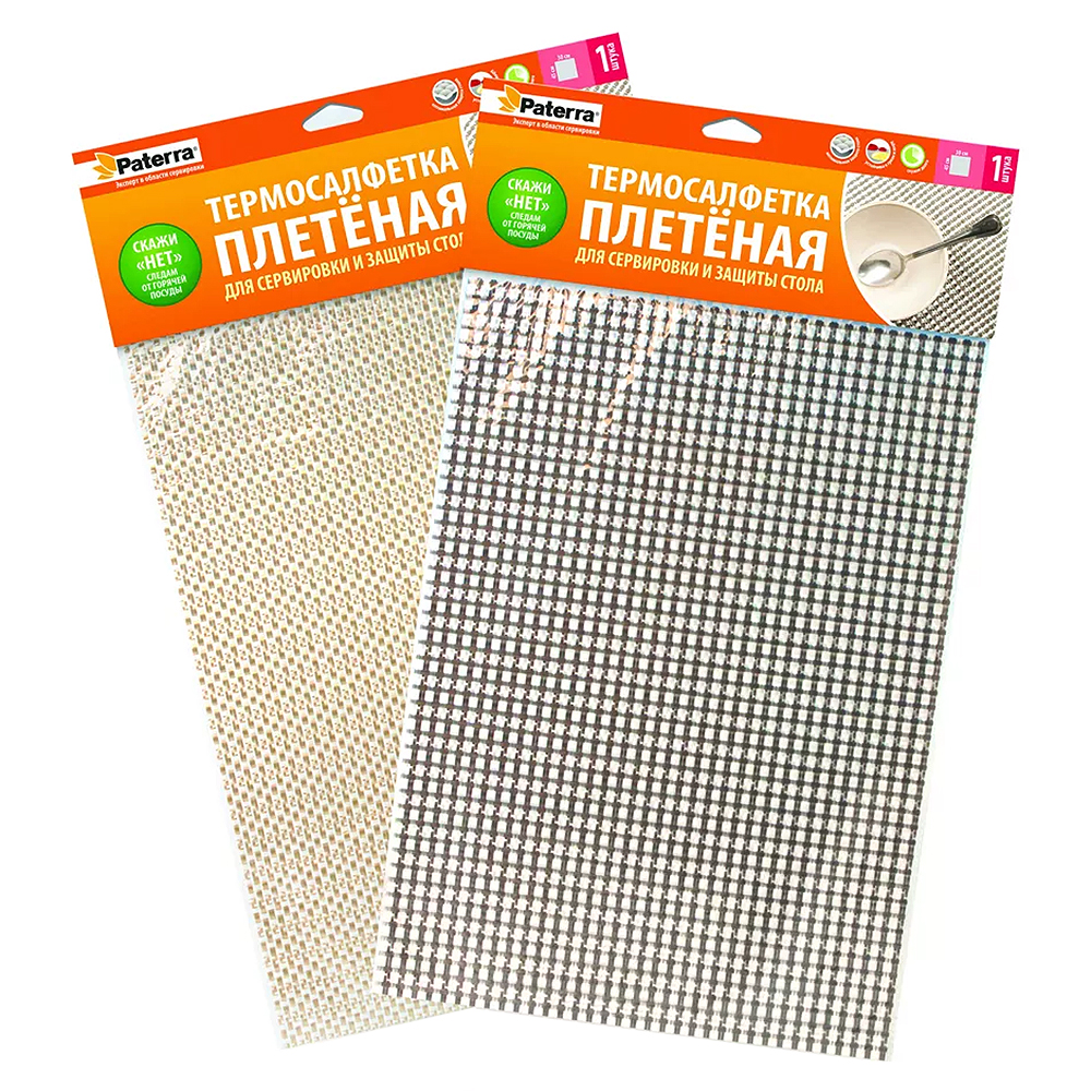Плетеные термосалфетки Paterra, длиной 45 см, шириной 35 см, в упаковке по 1 штуке. Устойчивы к высоким температурам, обладают отличной износостойкостью. Плетеная поверхность не скользит по столу. Материал – поливинилхлорид.