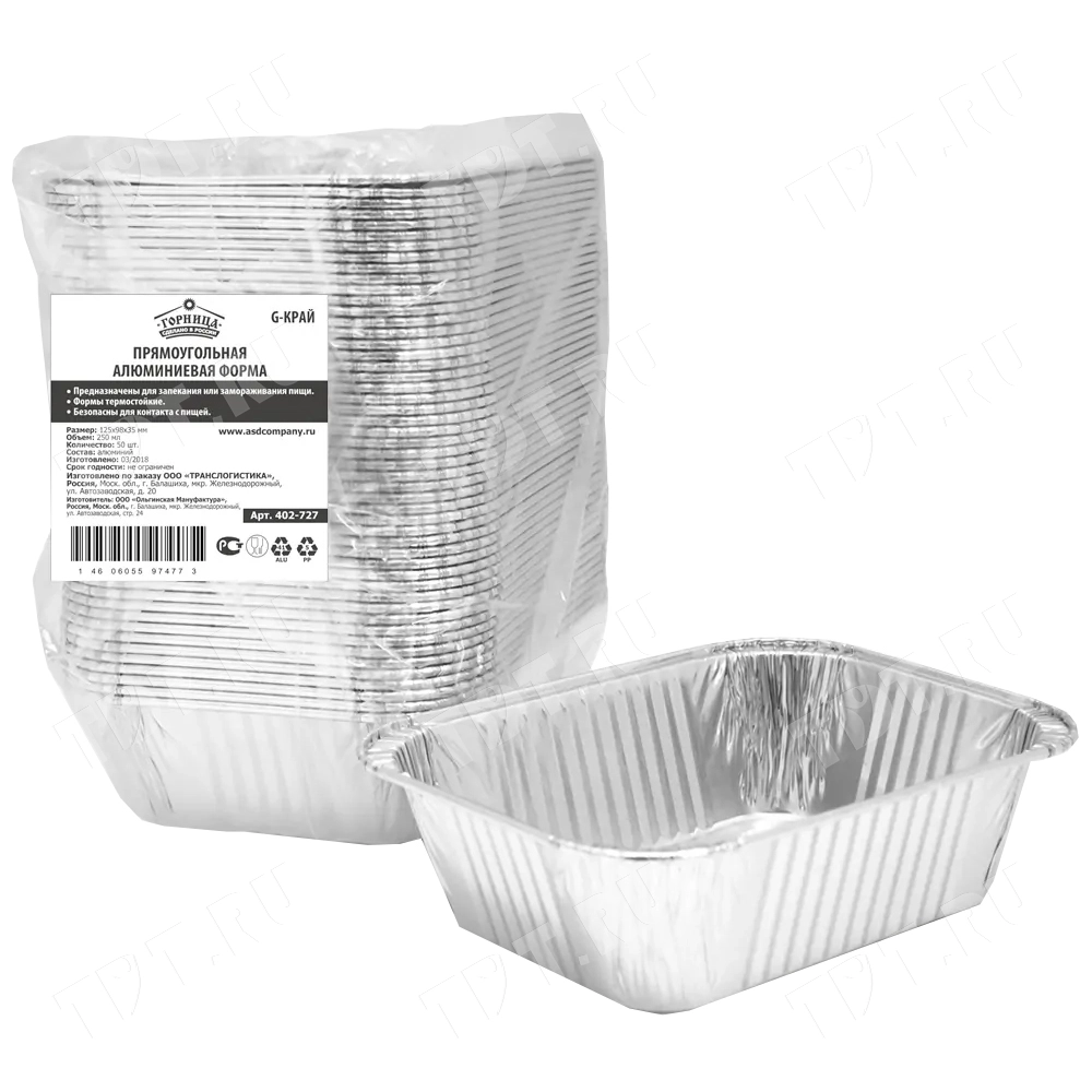 Одноразовые алюминиевые формы «Горница» прямоугольные с G-краями, объемом 0.25 л, длиной 12.5 см, шириной 9.8 см, высотой 3.5 см, в упаковке по 50 штук. Материал – алюминий. Производятся в России.