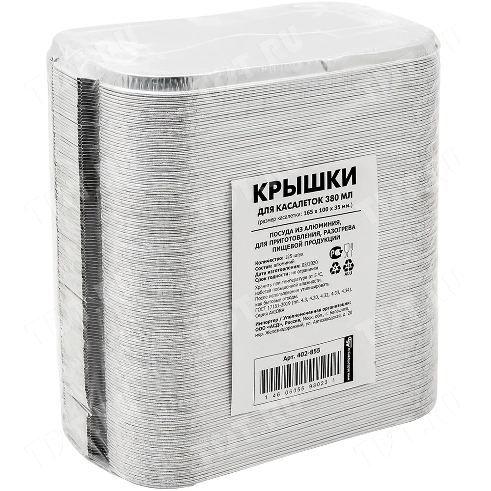 Крышки алюминиевые для алюминиевых форм касалеток 380 мл, прямоугольные, 9603719, длиной 16.5 см, шириной 10 см, в упаковке по 125 штук. Производятся в России.