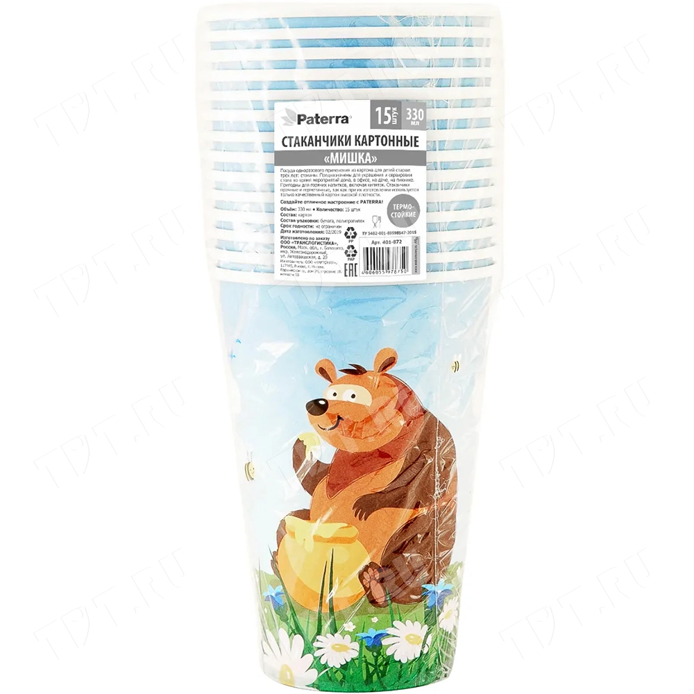 Стаканчики картонные с рисунком «Мишка» Paterra, термостойкие, объемом 330 мл, длиной 180 мм, в упаковке по 15 штук. Производятся в России.