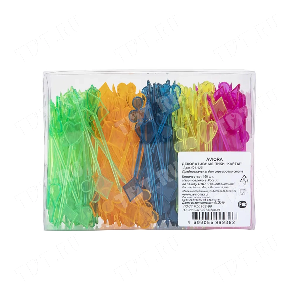 Одноразовые декоративные пластиковые пики «Карты», разного цвета, длиной 90 мм, в упаковке по 400 шт. Материал – пищевой полистирол.