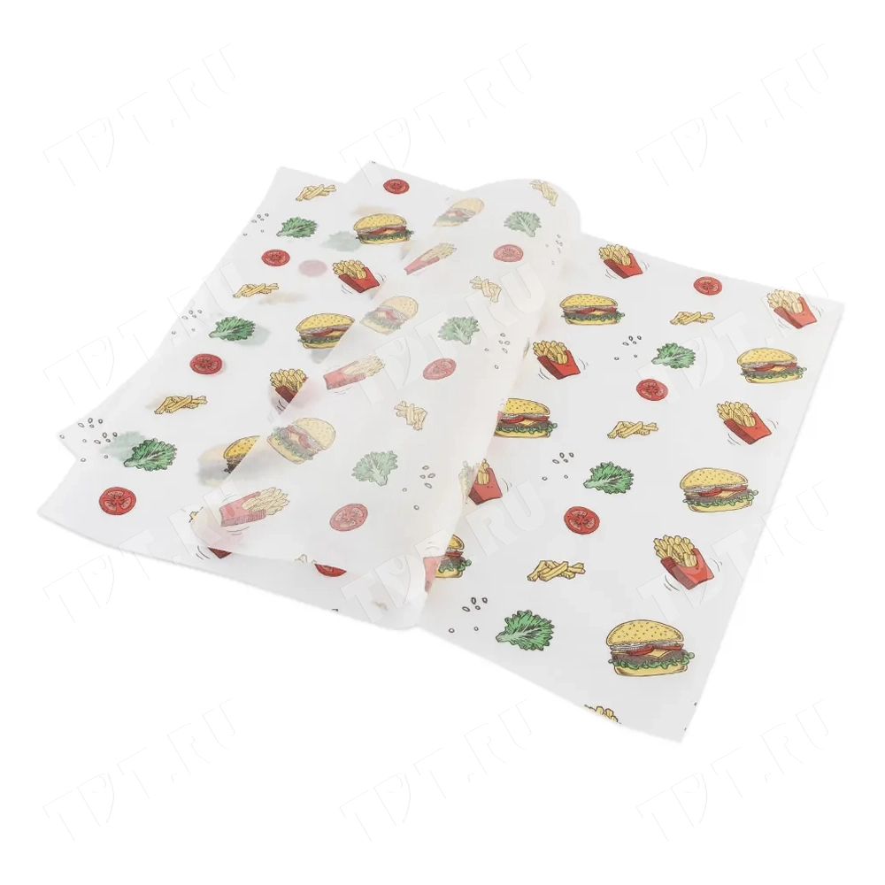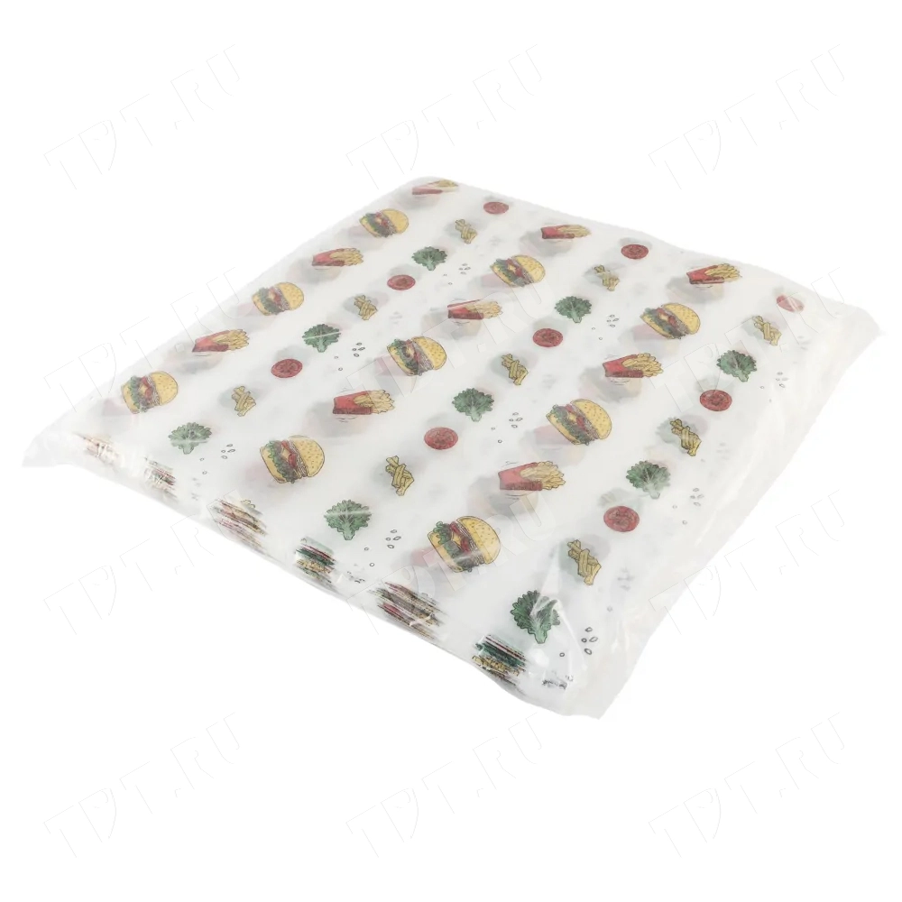 Жиростойкая и влагозащитная оберточная бумага с парафином «Гамбургер» с рисунком, белого цвета, квадратная, длиной 305 мм, шириной 305 мм, в упаковке по 500 шт. Материал – пищевая бумага и парафин.