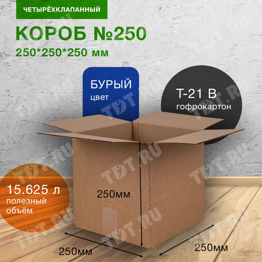 Квадратный картонный короб №250 для переезда, длиной 250 мм, шириной 250 мм и высотой 250 мм. Изготовлен из трехслойного картона марки Т-21 В. Полезный объём — 15.625 л.