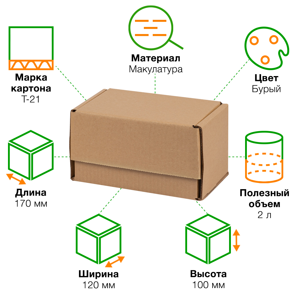Почтовый короб «Бизнес» тип «Ж» бурого цвета, длиной 170 мм, шириной 120 мм и высотой 100 мм. Изготовлен из трёхслойного гофрокартона Т-21. Полезный объём — 2 л.