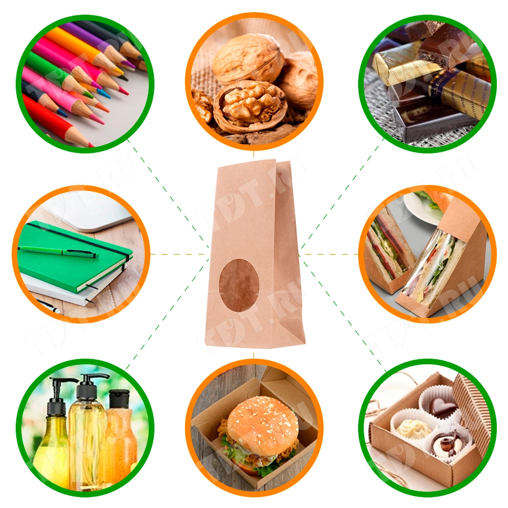 Бумажный пакет используются для упаковки, переноски, хранения продуктов питания и бытовых товаров. Они незаменимы в пекарнях, кафе, ресторанах и на фудкортах.