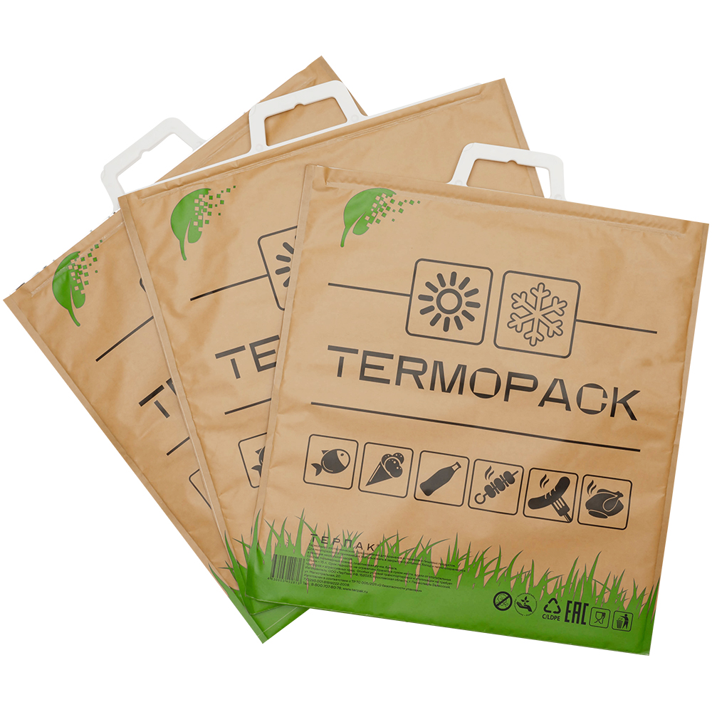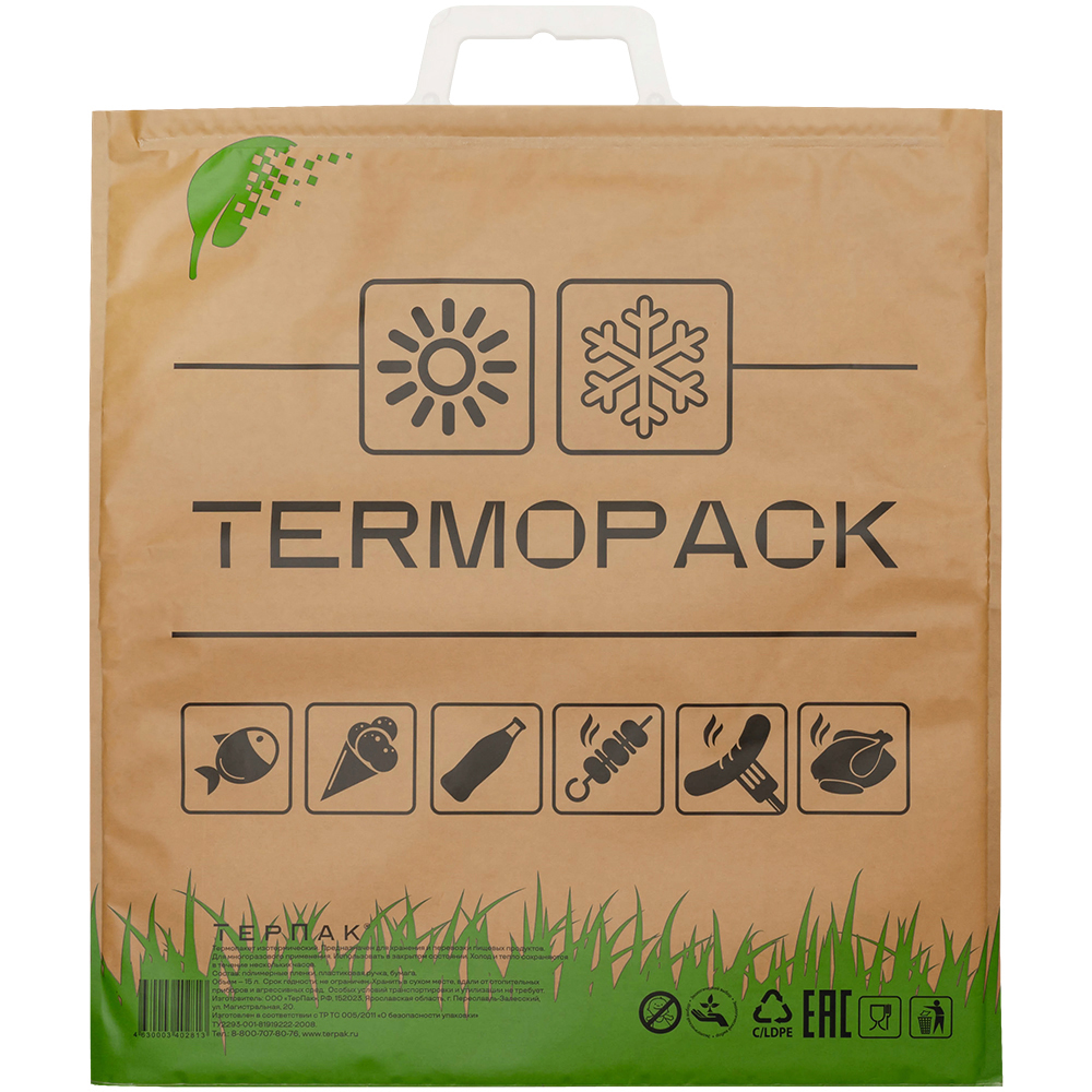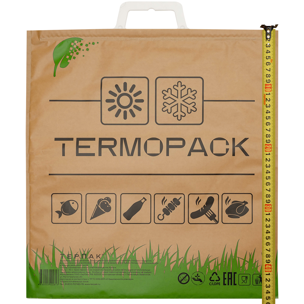 Крафт термопакет для пищевых продуктов Терпак, шириной 420 мм, высотой 450 мм, объемом 15 л, грузоподъемностью до 7 кг. Многоразовый термопакет сохраняет холод до 6 часов. Производится в России.