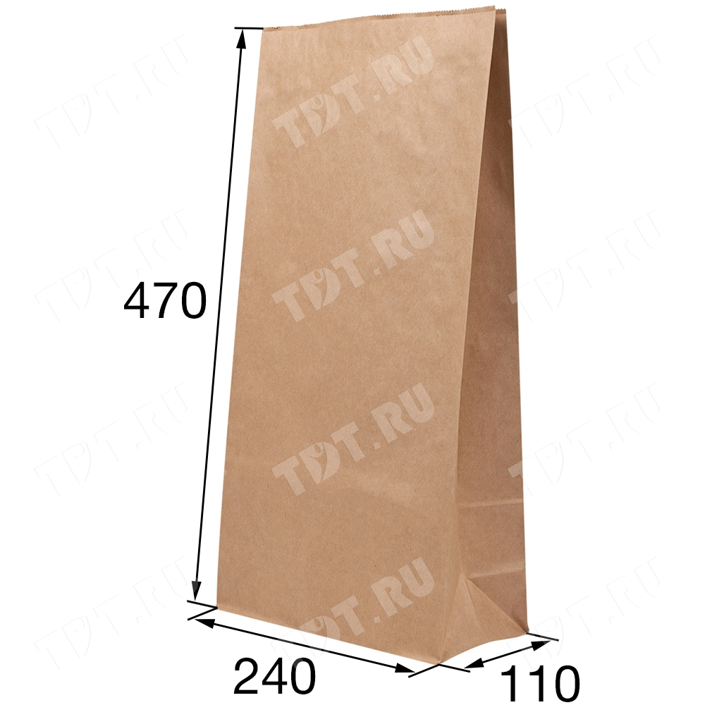 Бумажный двухслойные крафт мешок без ручек шириной 110 мм, длиной 240 мм, высотой 470 мм изготовлен из экологичного материала. Мешки производятся в России.