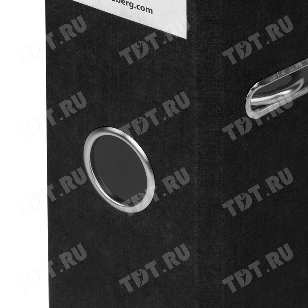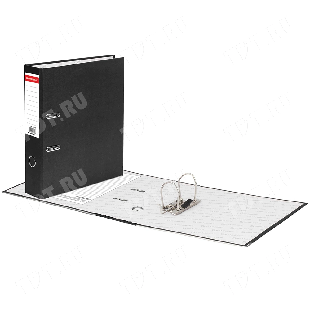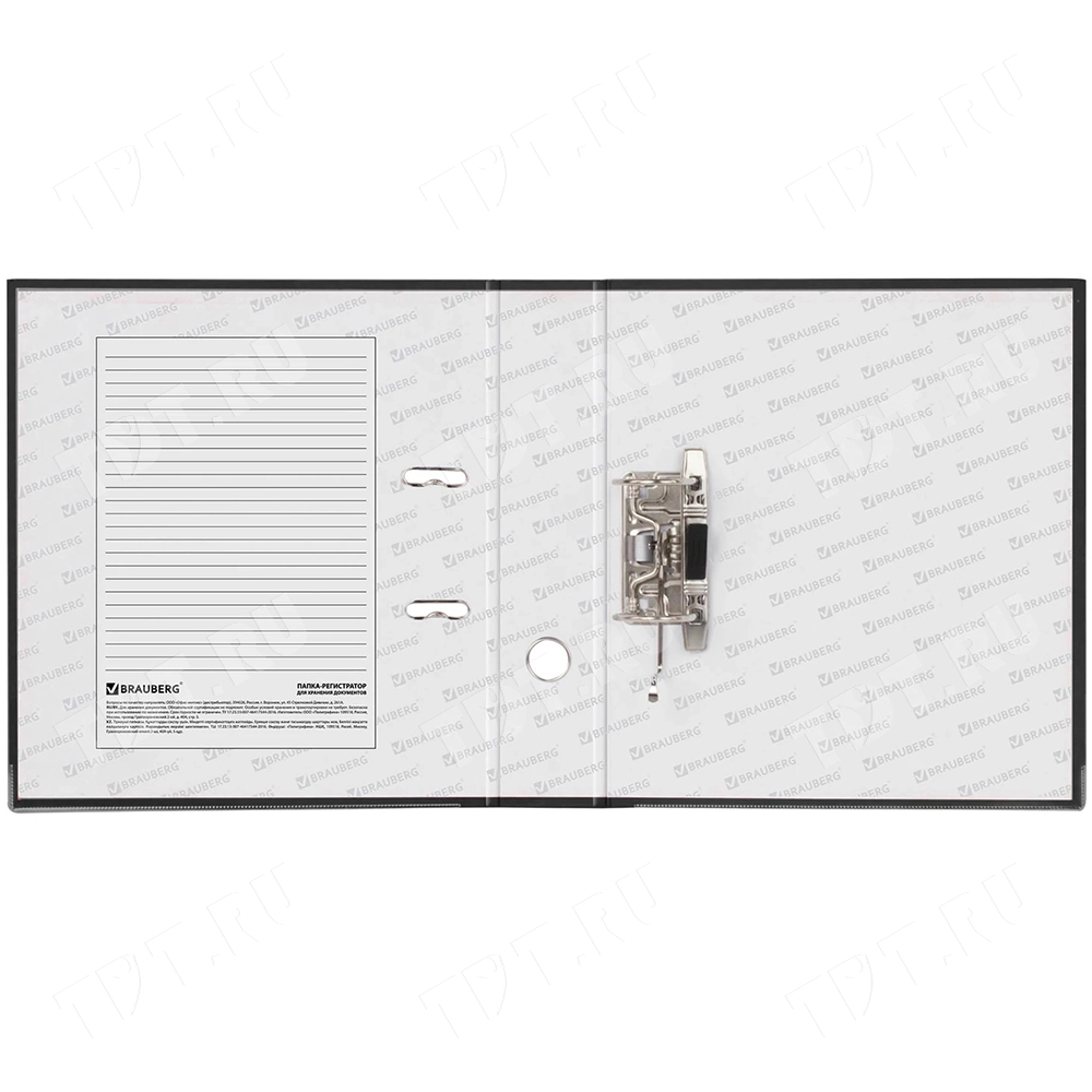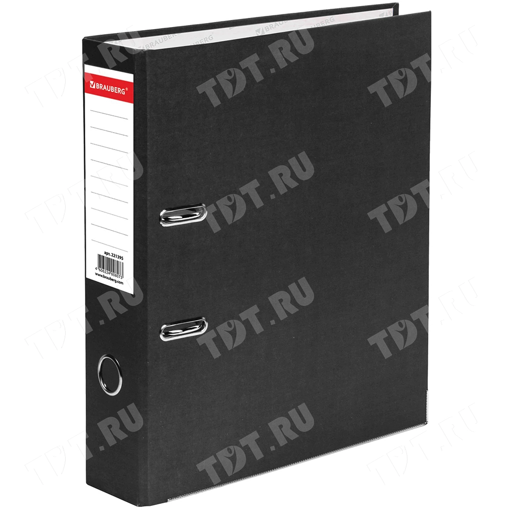 Папка-регистратор Brauberg «Eco», код производителя 221395, черного цвета, форматом А4, шириной корешка в 75 мм, с размещением до 500 листов. Материал – высококачественный износоустойчивый картон и бумага. Производится в России.