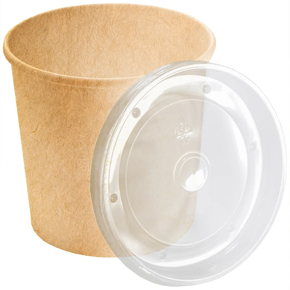 Небольшие картонные крафт супницы с полипропиленовыми крышками, бурого цвета, объемом 320 мл, в упаковке по 25 штук. Производятся в России.