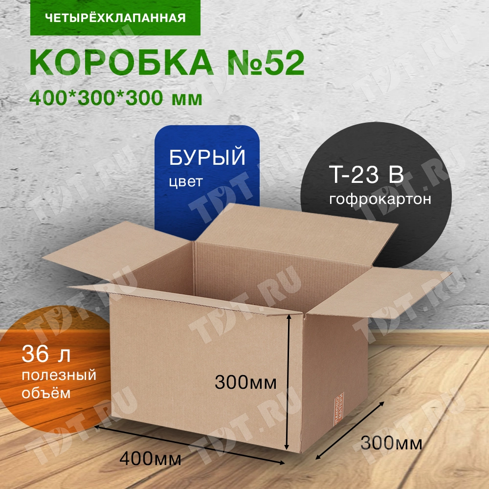 Картонный короб №52 для переезда, длиной 400 мм, шириной 300 мм и высотой 300 мм. Изготовлен из трехслойного картона марки Т-23. Полезный объём — 36 л. Максимально допустимая нагрузка — 13-15 кг.