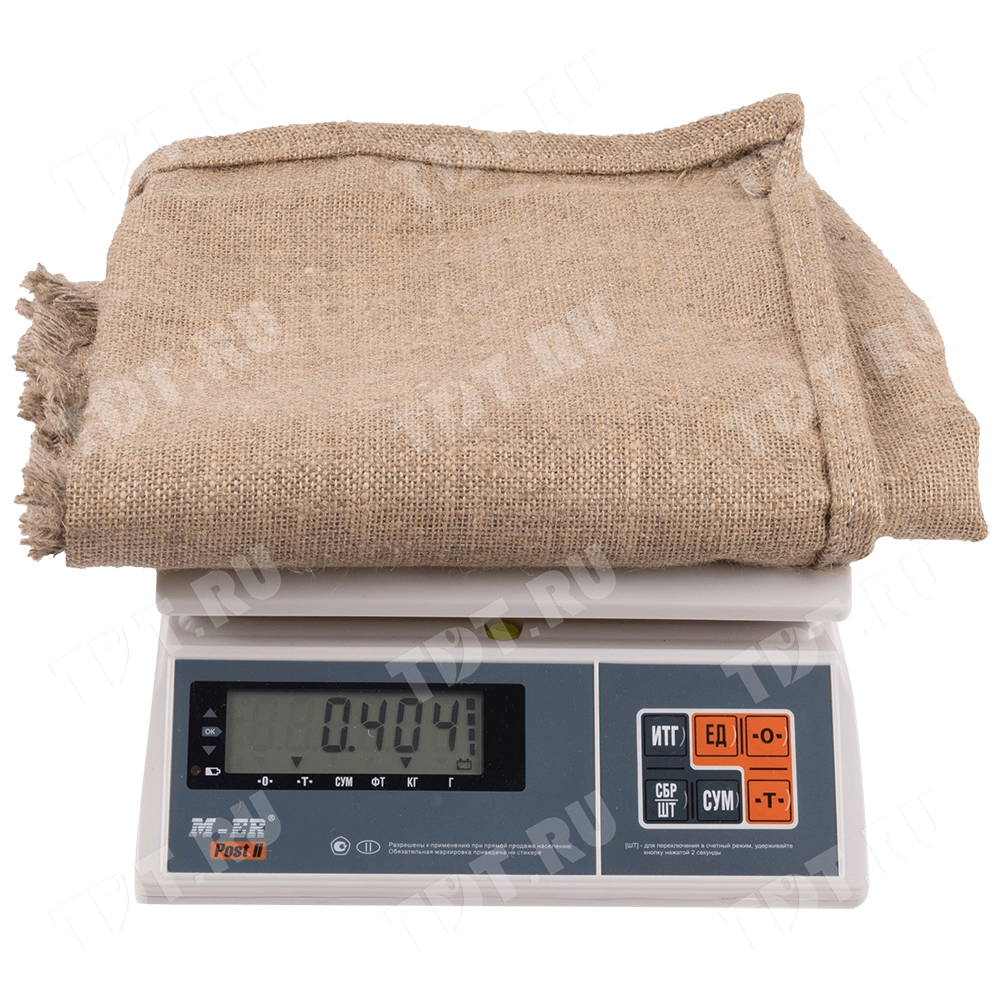 Джутово-льняной мешок, длиной 96 см, шириной 56 см, плотностью 290 г/м², весом 404 г. Изготовлен из 50% джута и 50% льна. Производится в России.