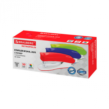 Степлер BRAUBERG для скоб №24/6 и №26/6, пробивает 30 листов бумаги, цвет ассорти, код производителя 228753, длиной 115 мм, шириной 30 мм, высотой 50 мм, весом 156 г. Материал корпуса – пластик. Производится в Индии.