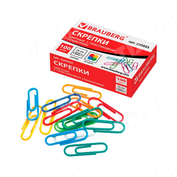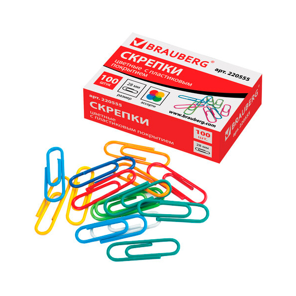 Скрепки BRAUBERG в картонной коробке, цвет ассорти, код производителя 220555, длиной 28 мм, шириной 8 мм. Материал – сталь с пластиковым покрытием. Производится в России.