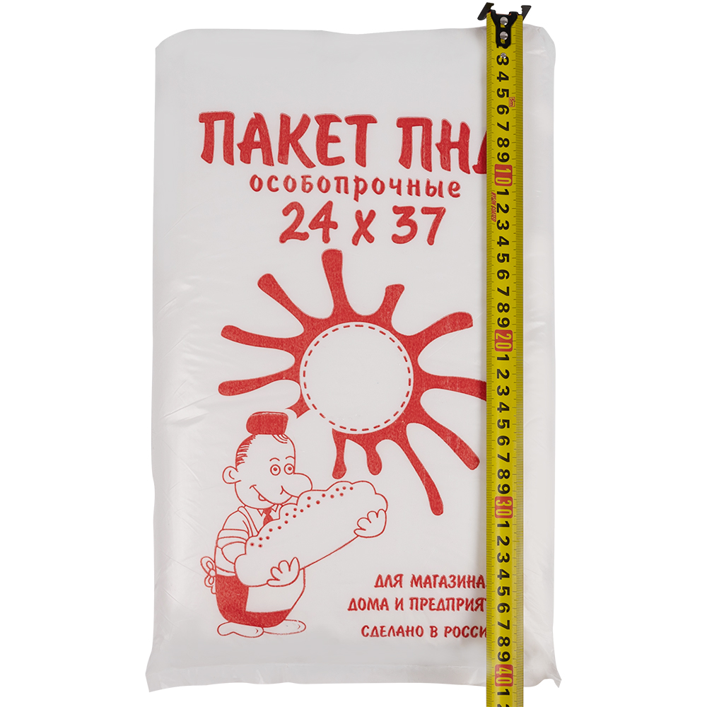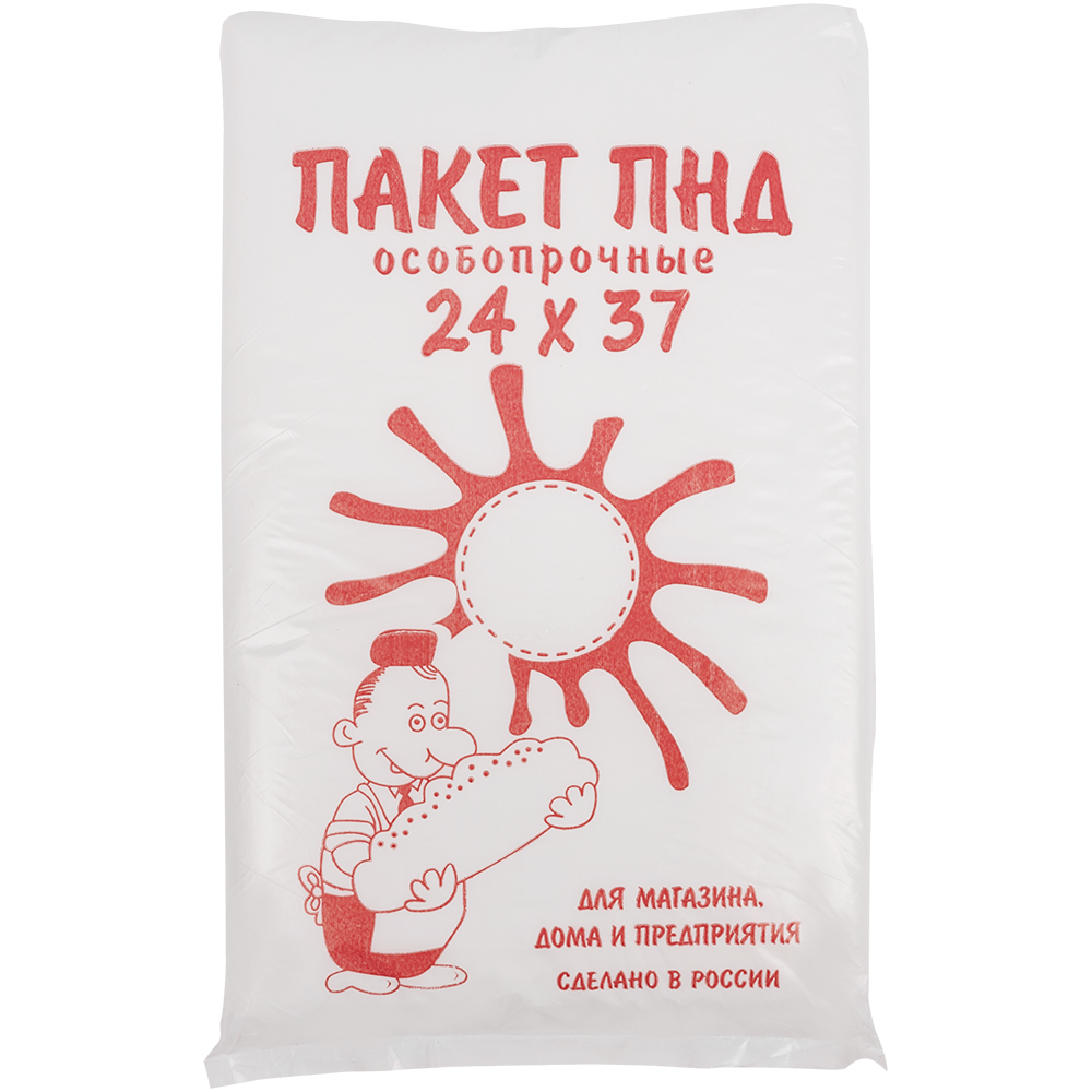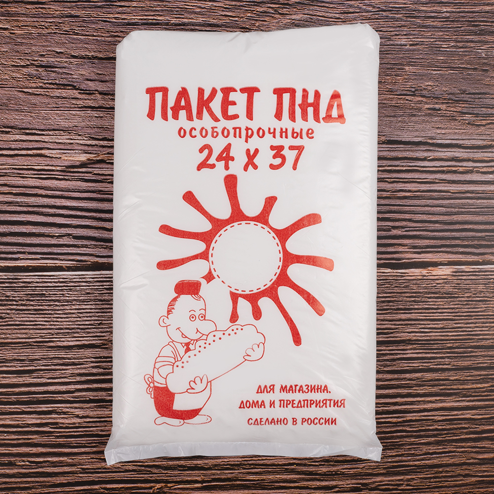 Прозрачные фасовочные пакеты ПНД особопрочные в пластах для упаковки длиной 37 см, шириной 24 см, толщиной 14 мкм, в упаковке по 500 штук. Материал – полиэтилен низкого давления. Отвечают требованиям ГОСТа на плёнку ПНД (16338-85). Производятся в России.