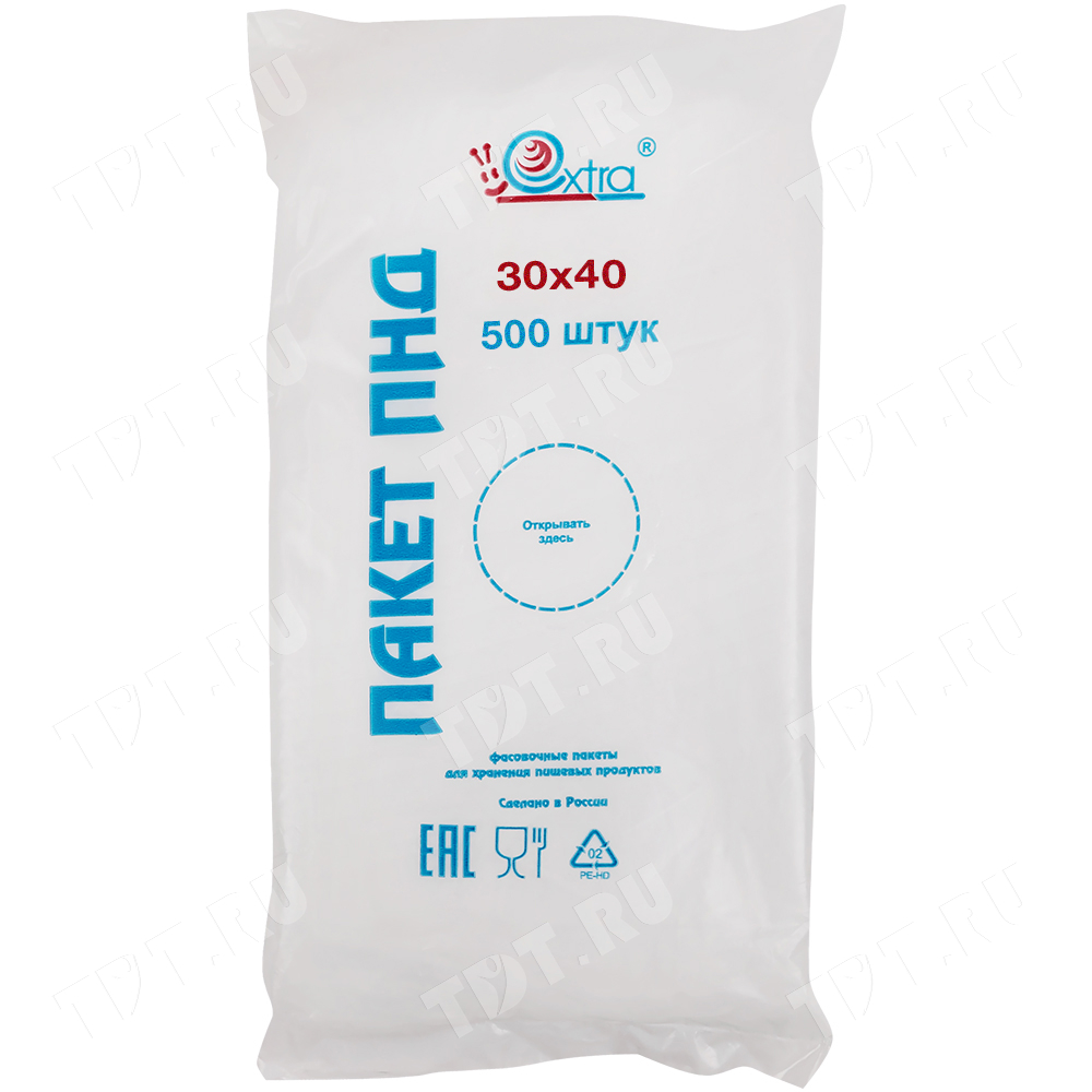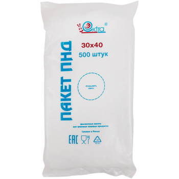 Прозрачные фасовочные пакеты ПНД в пластах «EXTRA», особопрочные для упаковки длиной 40 см, шириной 30 см, толщиной 10 мкм, в упаковке по 500 штук. Материал – полиэтилен низкого давления. Отвечают требованиям ГОСТа на плёнку ПНД (16338-85). Производятся в России.