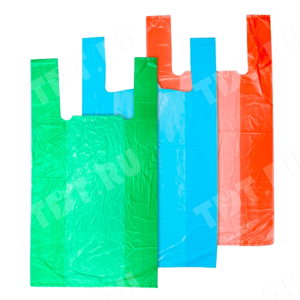 Полиэтиленовые пакеты майка ПНД цветные в ассортименте, длиной 40 см, шириной 24+12 см, толщиной 6 мкм, в упаковке 100 штук. Материал – полиэтилен низкого давления. Производятся в России.