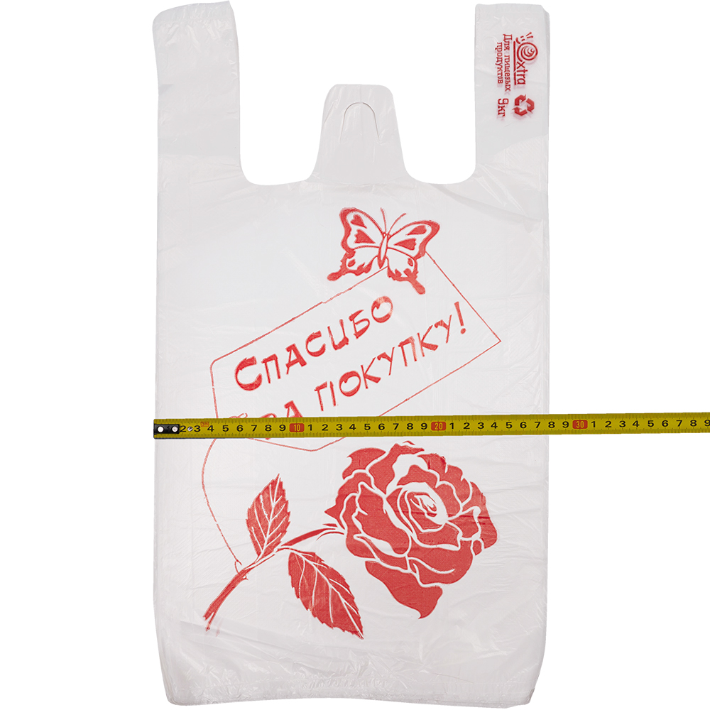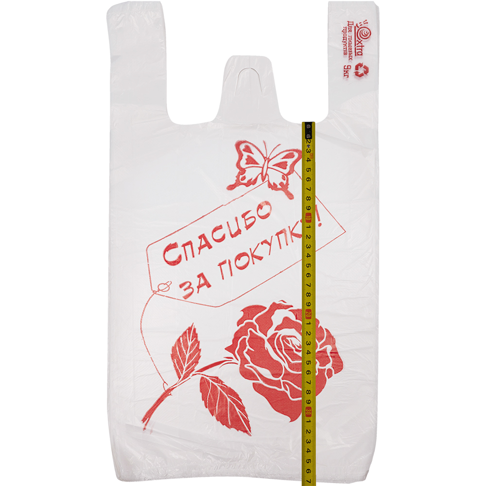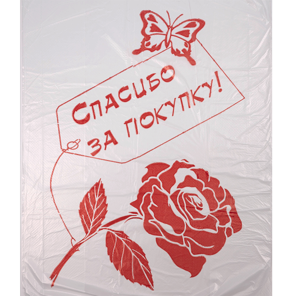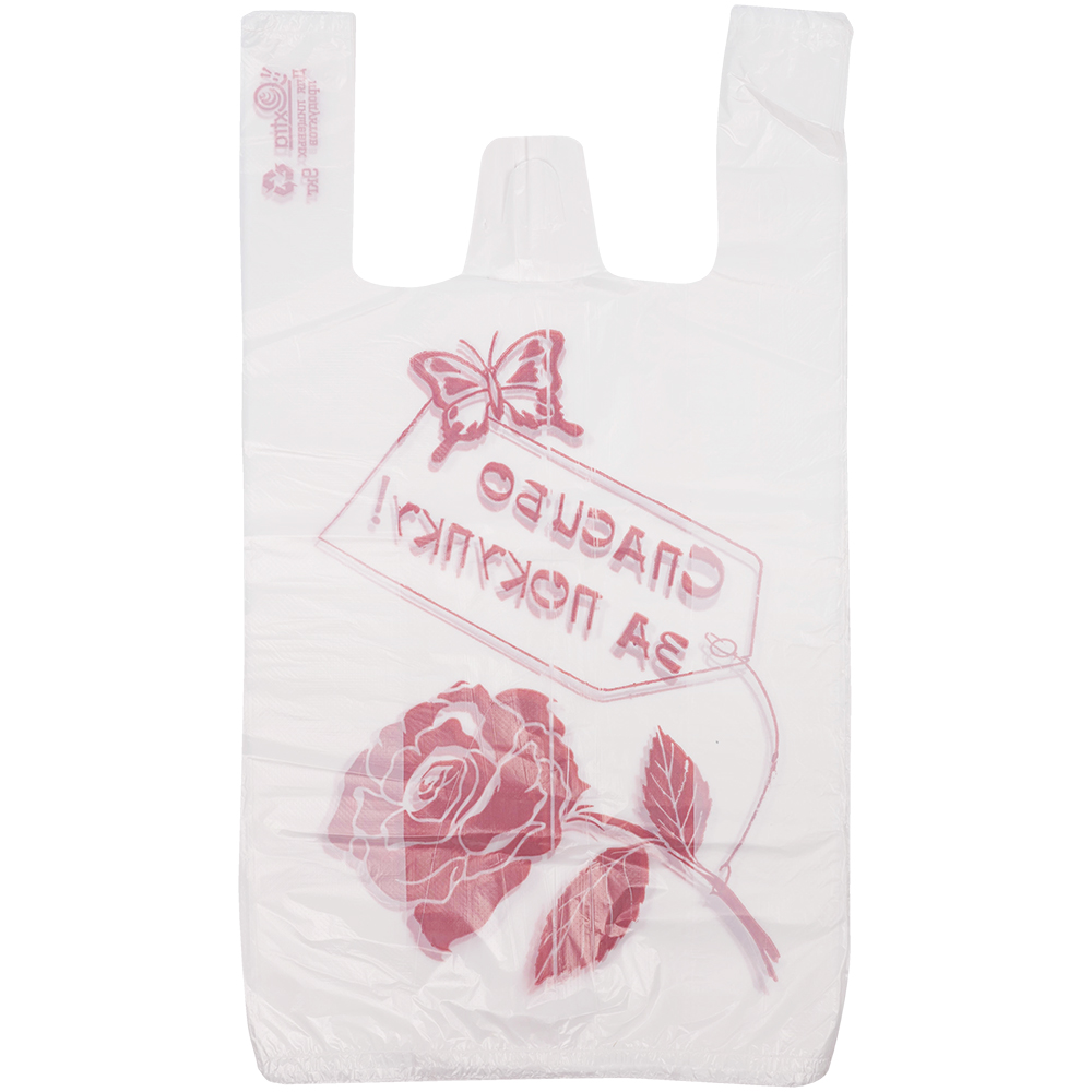 Полиэтиленовые пакеты майка ПНД «Роза» с надписью «Спасибо за покупку», белого цвета, длиной 50 см, шириной 28+16 см, толщиной 12 мкм, в упаковке 100 штук. Материал – полиэтилен низкого давления. Производятся в России.