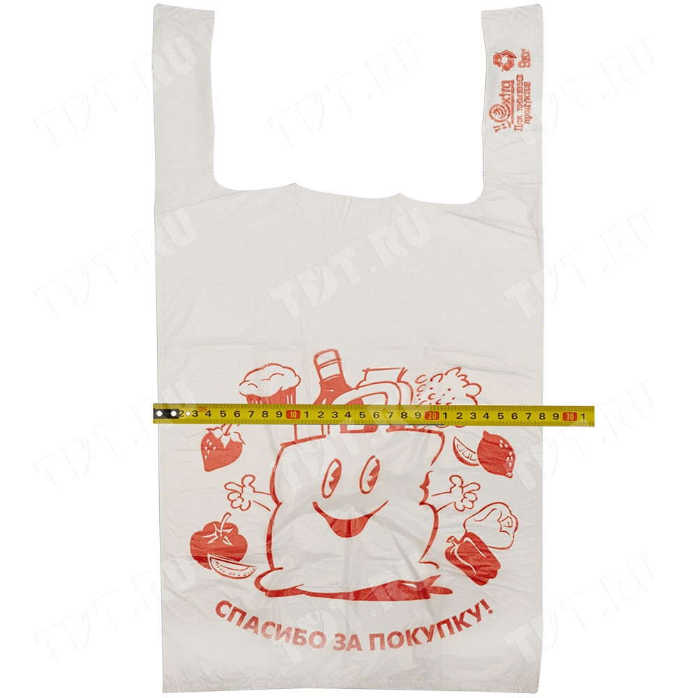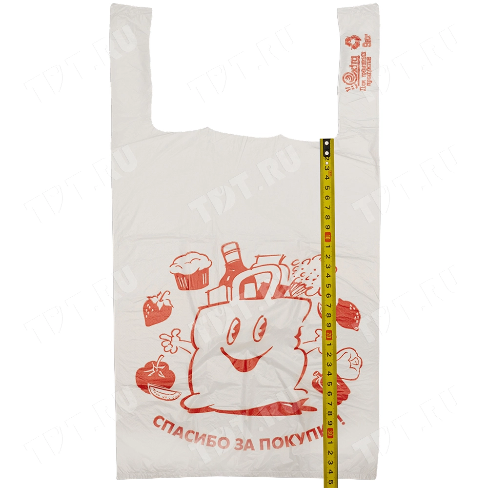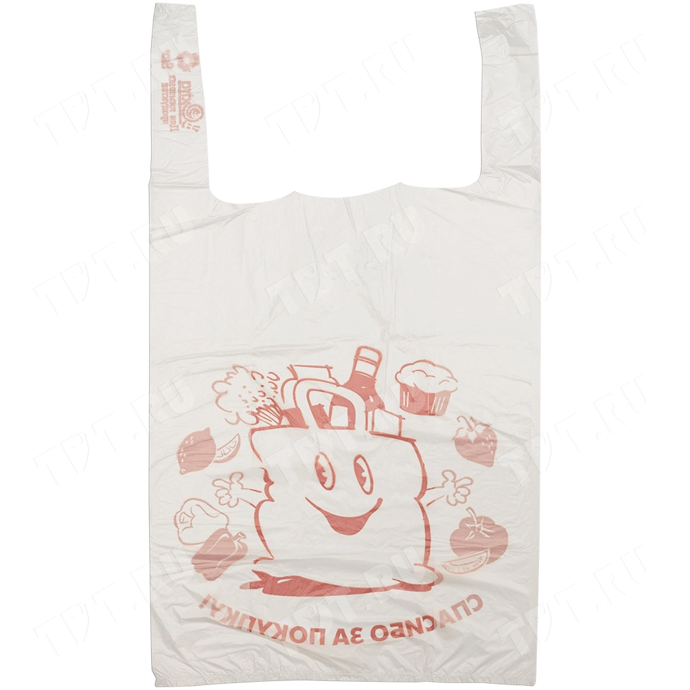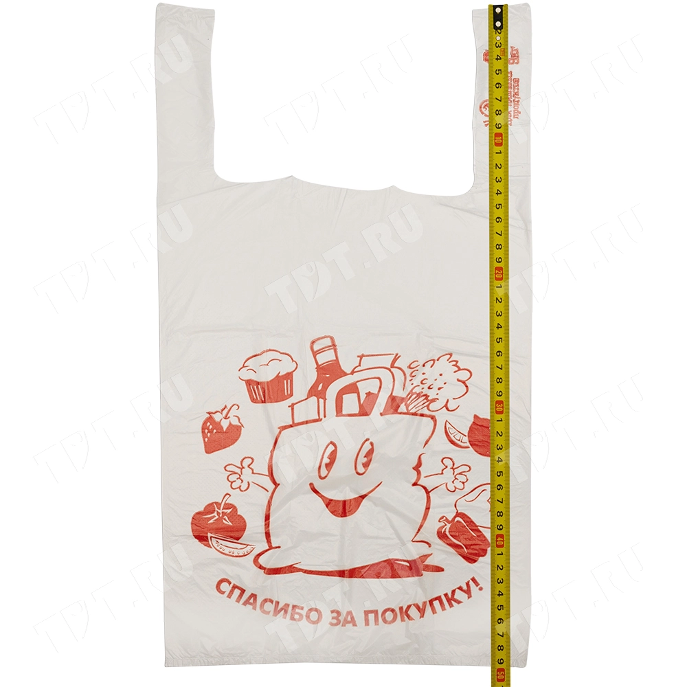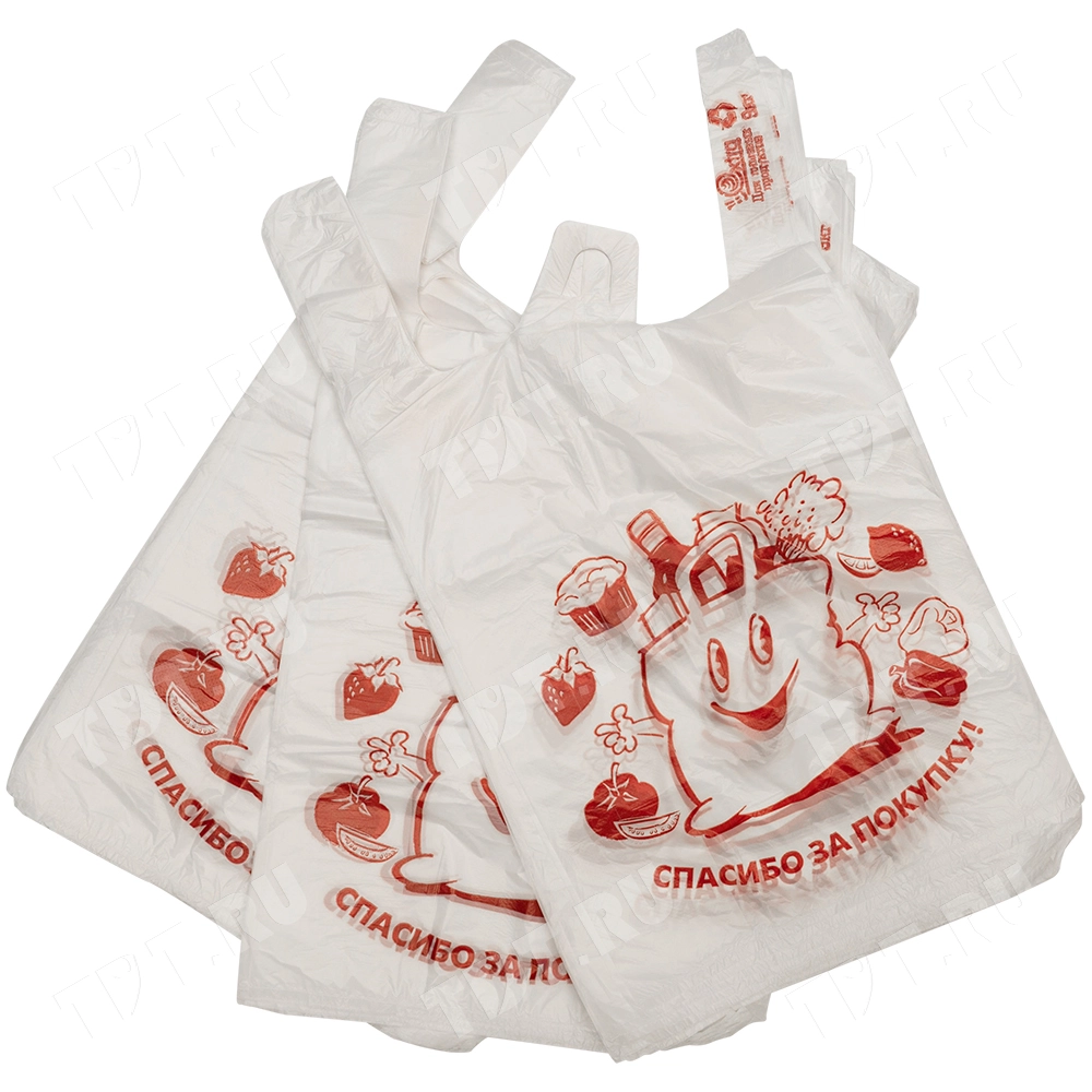 Полиэтиленовые пакеты майка ПНД с надписью «Спасибо за покупку», белого цвета, длиной 50 см, шириной 28+16 см, толщиной 12 мкм, в упаковке 100 штук. Материал – полиэтилен низкого давления. Производятся в России.